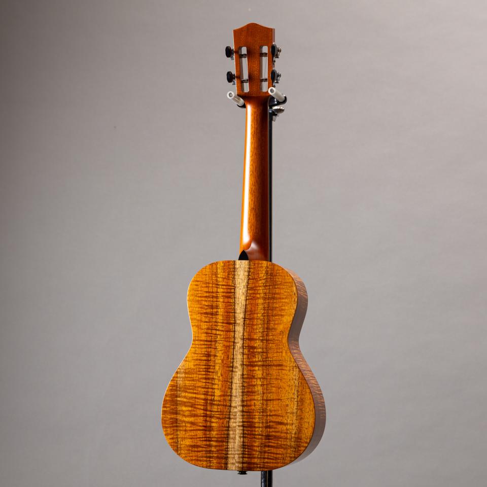 テナーらしい圧倒的な音量の中に、太く甘い極上のトーンを宿しています。現在はHi-Gセッティングでクリアナイロン弦が張られています。Mi-Si Acousitc Trio UKピックアップを搭載しておりますので、ステージでのパフォーマンスも大変便利です。