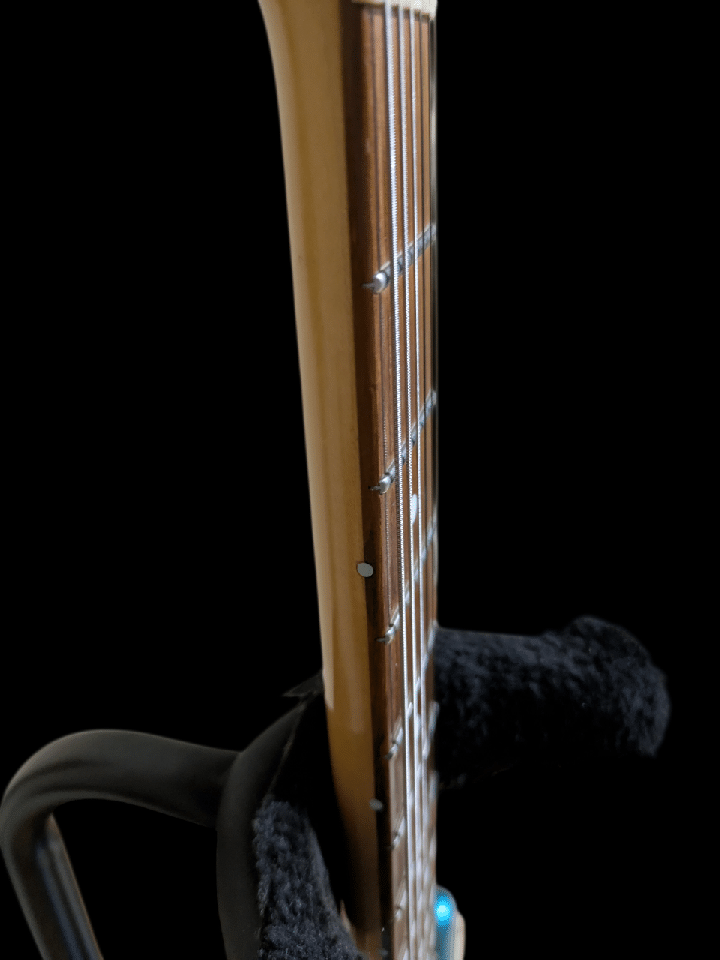 指板アールは約14インチとかなり平たく、チョーキングでの音詰まりの不安が解消され、弦高をより低く設定する事でモダンな演奏性を追求することができる仕様でルミンレイが施されステージでも安心して演奏できます。