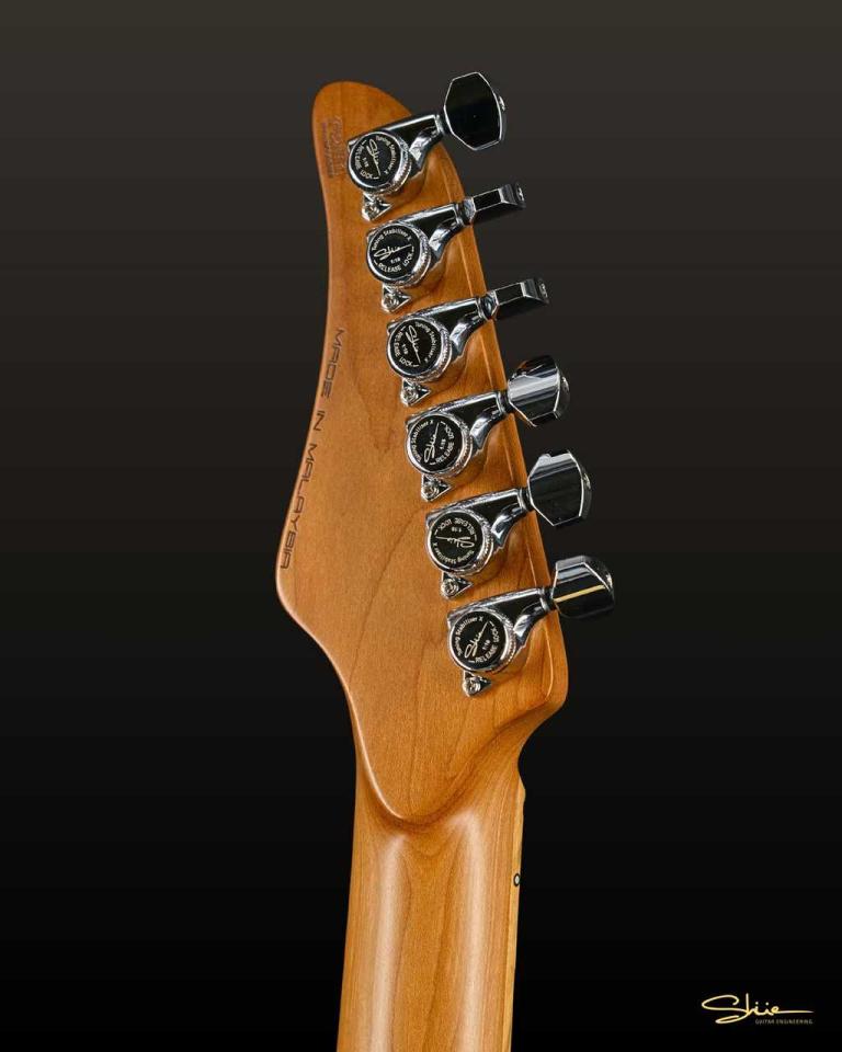 国土の約半分が森林に覆われたマレーシアならではの高級木材を贅沢に採用しており、主要モデルのボディ材には、音響特性に優れたジェルトン材(Jelutong:学名 Dyera costulata)を、指板にはマレーシア産ブラックウッド材(Blackwood:学名 Melanoxylon)を採用しています。その独特の木目と豊かで響き渡る音色は、Shue Guitarsならではのサウンドの特徴の一つです。
