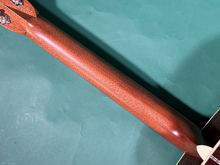 ナット幅は44.5mm、スケールは632.5mm。ブリッジサドルには、将来的なピックアップ装着を考慮し、ショートタイプを採用。ナット、サドルともにボーン製です。