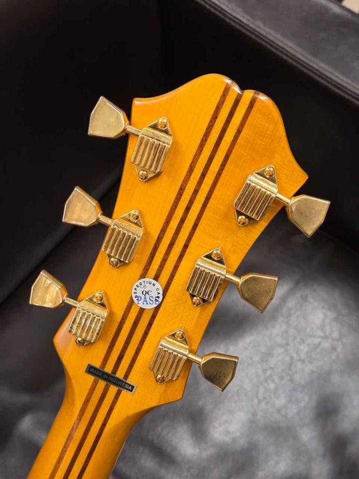 指板にはエボニー材を使用し、歴史的なパール・クラウド・インレイをあしらった華やかなルックスが存在感を強調。さらにボーン・ナット&サドルにより、自然な倍音と優れたサスティーンを確保しています。ゴールドのヴィンテージスタイル・ワッフルバック・チューナーがクラシカルな雰囲気を演出し、ステージ上でもひときわ目を引く一本に仕上がっています。