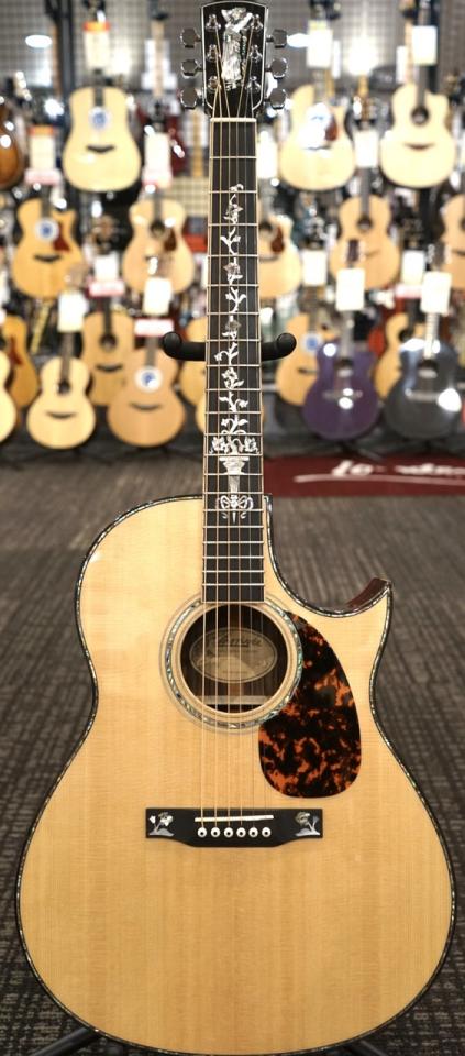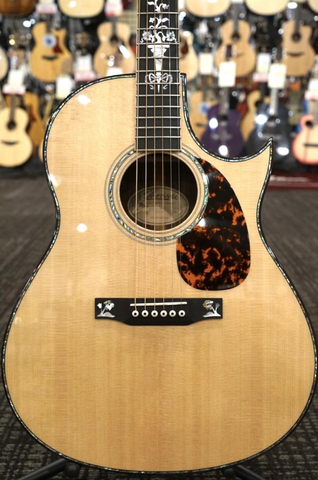 創始者ジャン・ラリビーによるカナダのギターLarrivee。独自のコンサートサイズにフロレインカッタウェイの。ヘッドに美しい女性と指板のフルレングス・ローズインレイが特徴の珍しいモデル。