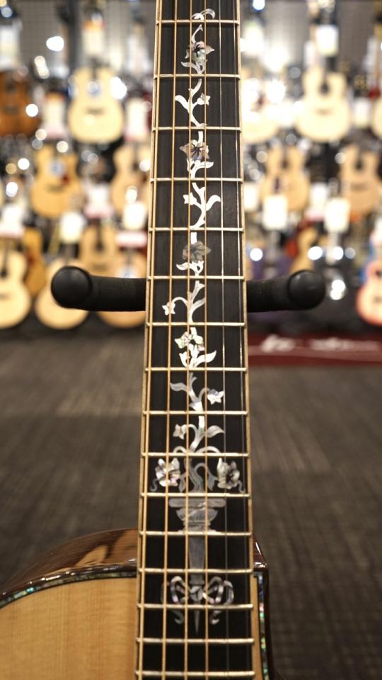 “Rose Lady”最大の特徴は、その名の通り指板全体に咲き誇る薔薇のインレイワークにあります。