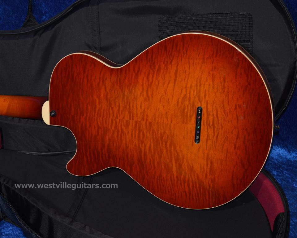 マホガニー・センターブロックを持つ単板セミホロウ「Water」をベースとして、ボディトップとバックにフルホロウ・モデル「Aruba」と同じ組み合わせのフィギュアド・ハードメイプル・プライウッドを用いたモデルが、こちらの「Watar M-Ply Plus」です!