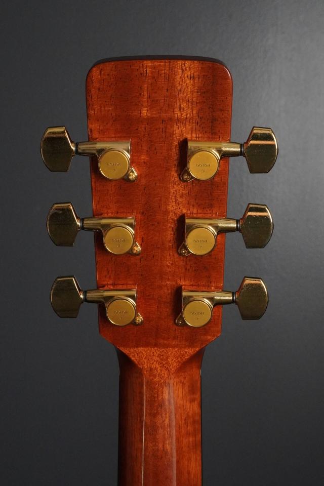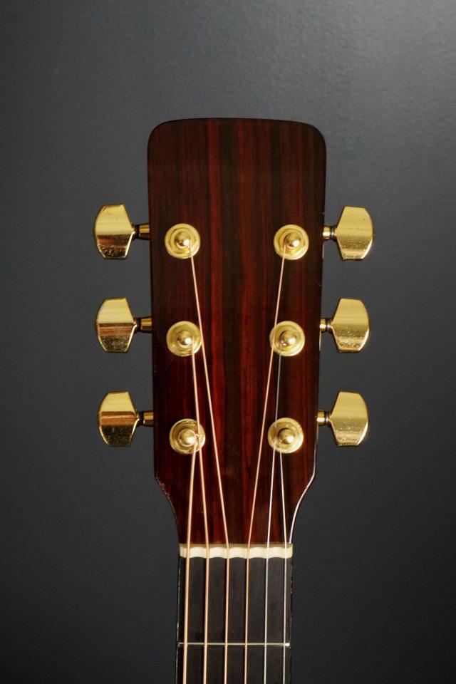 ヘッドの突板にも、ブラジリアンローズウッドが使われており、シンプルな造形ながらエキゾチックな杢目の、印象的なヘッドで、チューナーはゴールドのGotoh、素朴ながらも目を惹くルックスです。