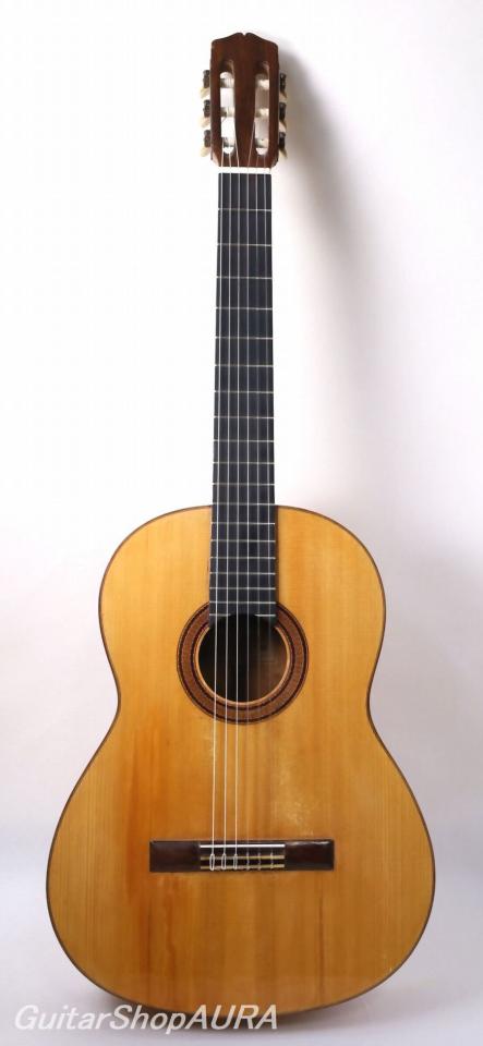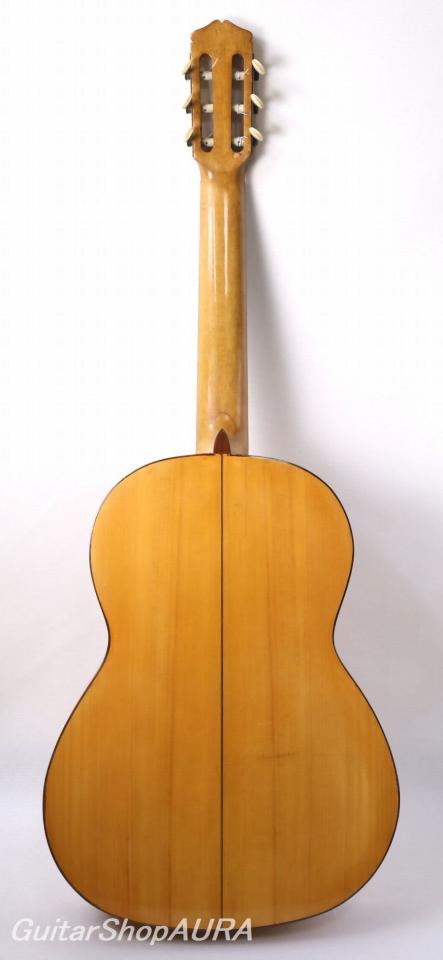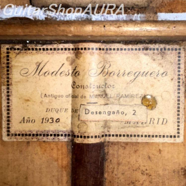 モデスト・ボレゲーロ製作、1930年製 Usedです。横裏板がシープレス仕様であることと内部構造の特徴から、フラメンコモデルとして作られたものと考えられます(現在はゴルペ板は剥がされており、両方の用途で使われています)。ラベルには「Antigua oficiel de Manuel Ramirez」の文言が印字されており、この時すでにボレゲーロは独立していましたが、敬愛する師の名前を継続して使用することで自身が正統なマヌエル・ラミレス工房の職人であったことを訴求していたことがうかがわれます。ラベルデザインもまたマヌエル・ラミレス的な意匠を受け継いでいるのですが、工房住所のところに貼り紙をして「Desengano.2」と訂正されており、ちょうどこの時期不安定な生活の中で転居を繰り返していた様子も読み取ることができます。実際二つの世界大戦、さらにはスペイン市民戦争による世情の煽りをまともに受けたこの製作家にとって、その中間の時期である1920年代から30年代半ばにかけては例えば兄弟子のサントス・エルナンデスのように充実した製作期となったはずであろうところ、やはり相当な苦労をしながらなんとか製作を続けていたようです。