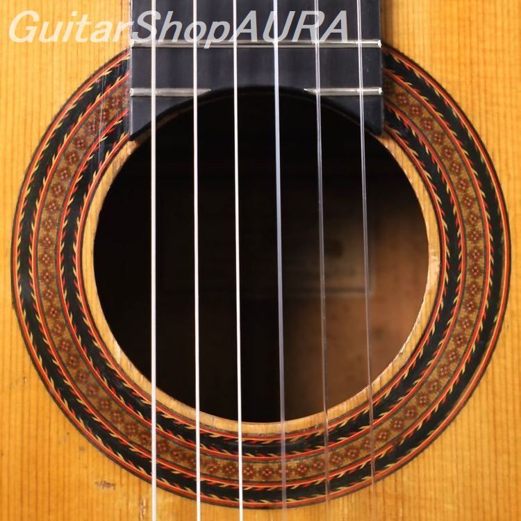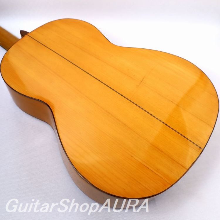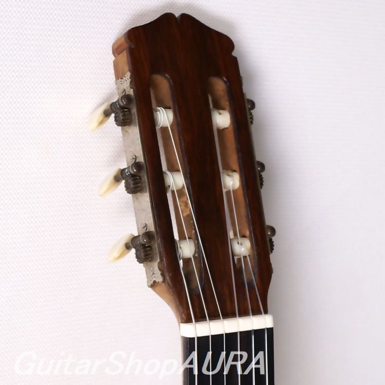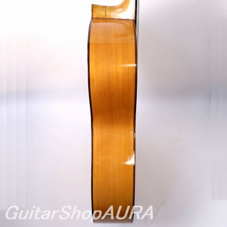 おそらくフラメンコモデルとしてタフな使用をそれなりに経てきたのでしょう、表面板(駒板脇と下、指板脇など)、横裏板(ネックヒール部分とボトム部エリアなど)それぞれに数か所ずつの割れ補修歴、セラックによる全体の再塗装歴があるほか、表面板は駒板の上下でやや凹凸型の歪みが見られます。キズに関しては過去に行われた再塗装の際のタッチアップ処理を経ていることから、現状ではさほどに多くはありません。表面板のサウンドホール周辺はやや多く見られるものの、その他は衣服による擦れやスクラッチ痕が数か所にあります。またヘッドの糸倉、6弦部分に割れ補修歴があります。ネックは真直ぐで、フレットも良好な状態を維持していますが、上述の表面板の経年の歪みによりネック自体はボディに対してやや角度がついてしまった形になっており、弦高値は3.0/3.6mm(1弦/6弦 12フレット)とフラメンコとしてはやや高めな設定で弦の張りも少し強めとなっています。サドル余剰は現状で0.5mm。ネックシェイプは薄めのDシェイプでコンパクトなグリップ感です。全体の重量は非常に軽く1.14kgとなっています。