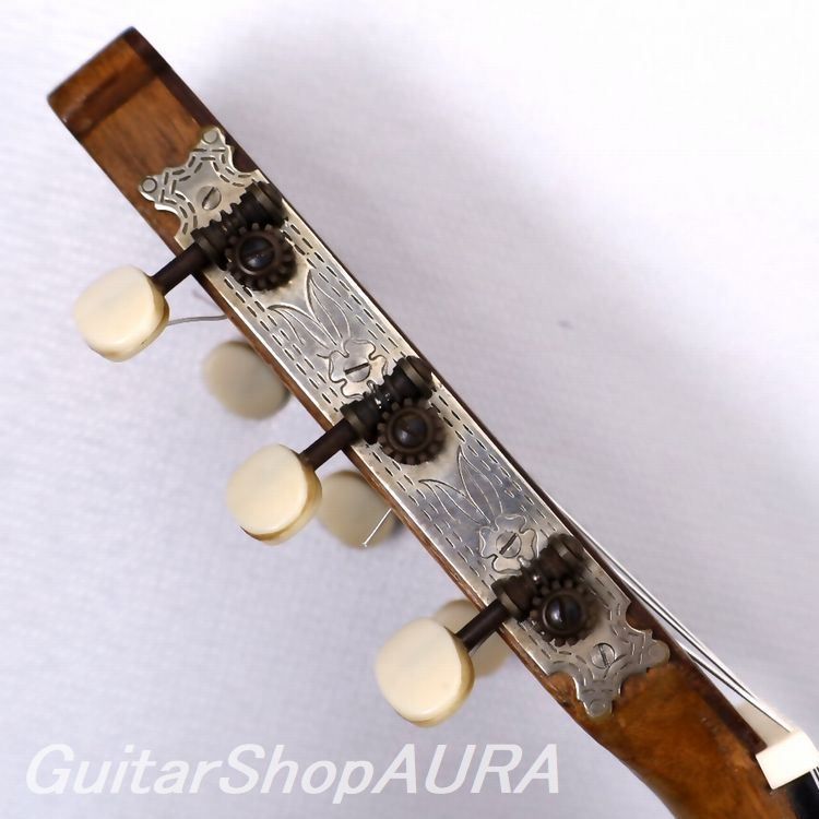 本作はまさにそのような時期の一作で、興味深く、また魅力的な一本となっています。一見してサントス・エルナンデスの影響下にあることが分かる外観(ヘッドシェイプ、ロゼッタデザインなど)で、その影響は表面板の力木配置にも如実に見て取れます。