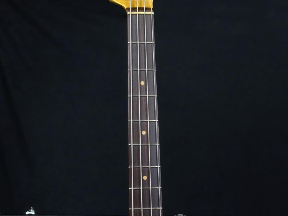 アルダーボディにメイプルネック、スラブ貼りのローズウッド指板というウッドマテリアル。カスタムショップの'62仕様ですとギター/ベース共にラウンド貼りの指板が多い印象ですが、本機は62年中期までのスラブ貼りを再現しています。