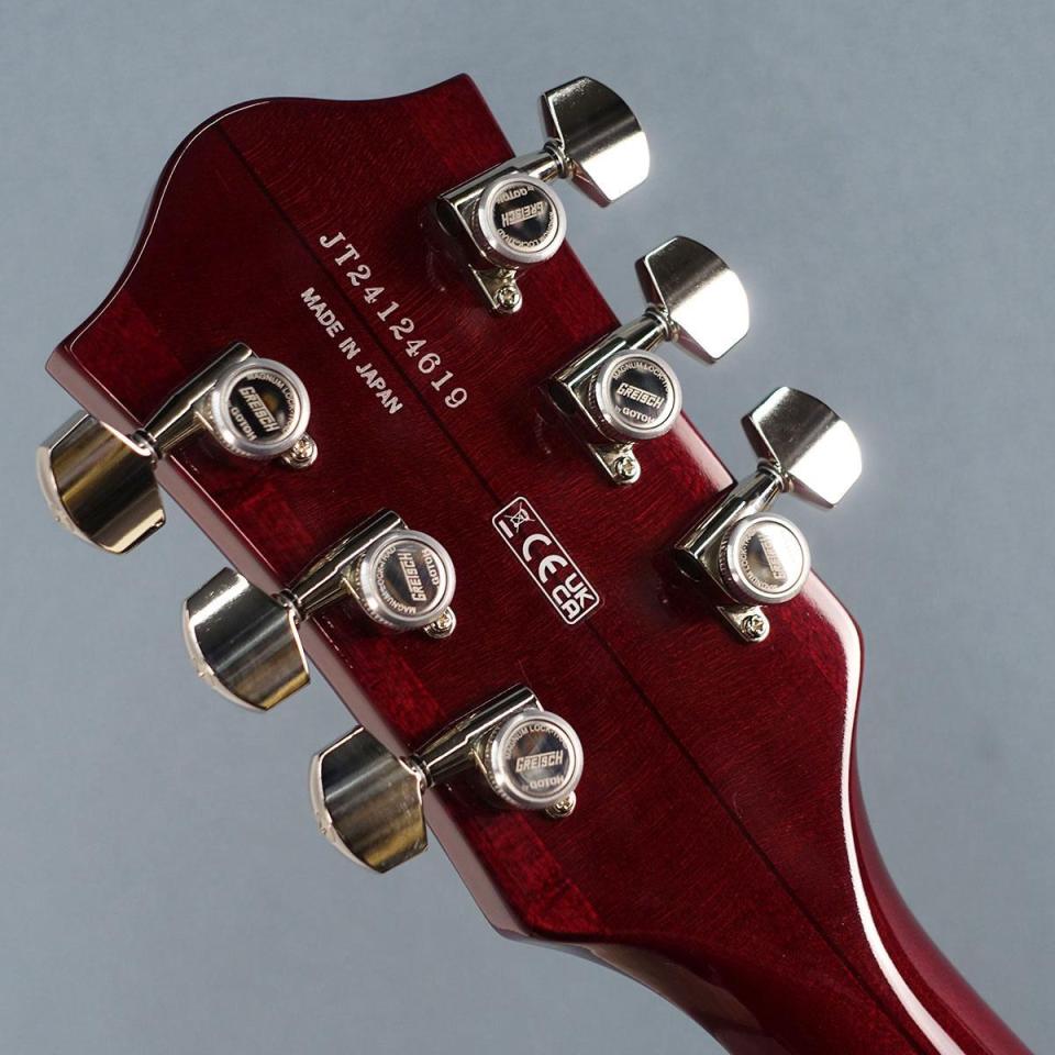 その他、ピン留めローズウッドベースのAdjusto-Maticブリッジ付きストリングスルーBigsby B6CPヴィブラート、Graph Tech TUSQ XLナット、Gotohロッキングチューナー&ストラップロックといったプレミアムな特徴を備えています。デラックスハードケースが付属します。