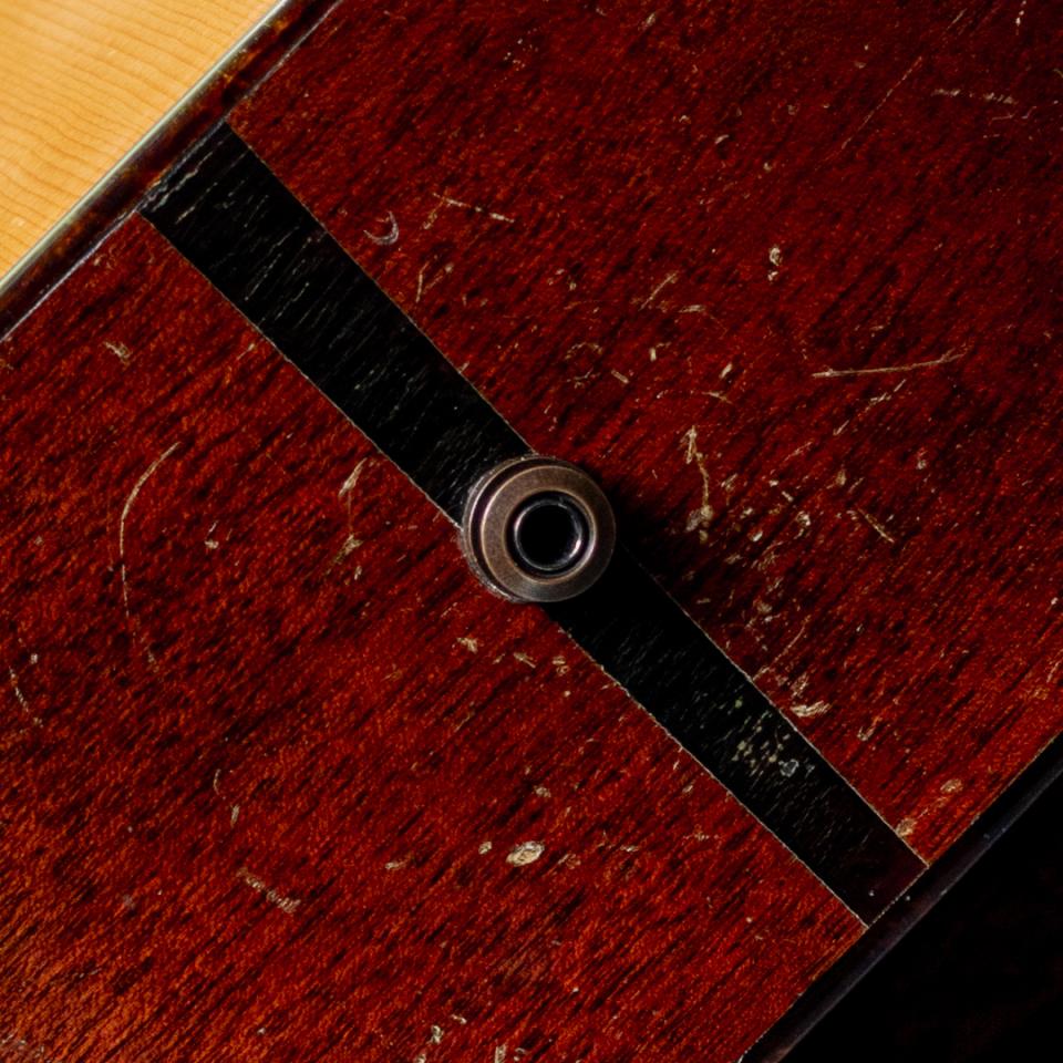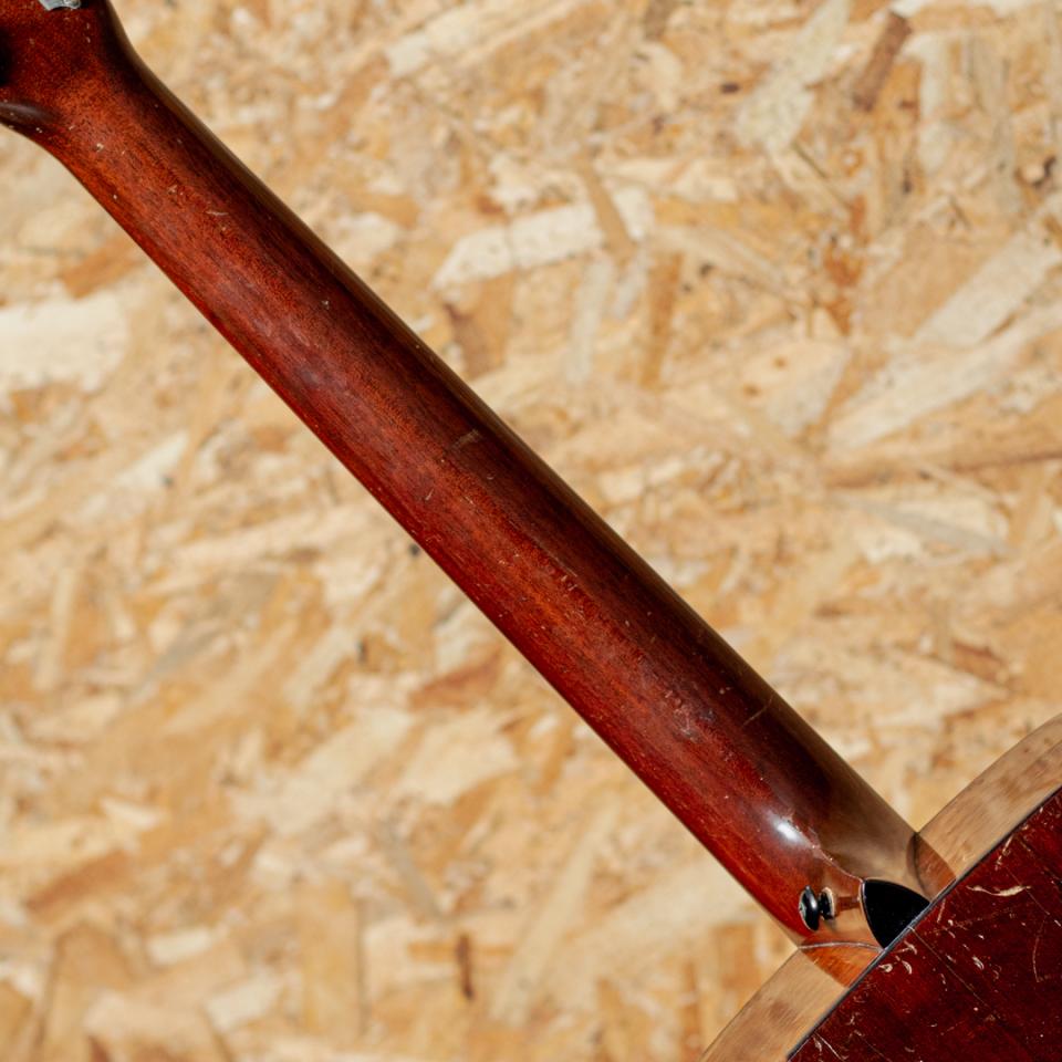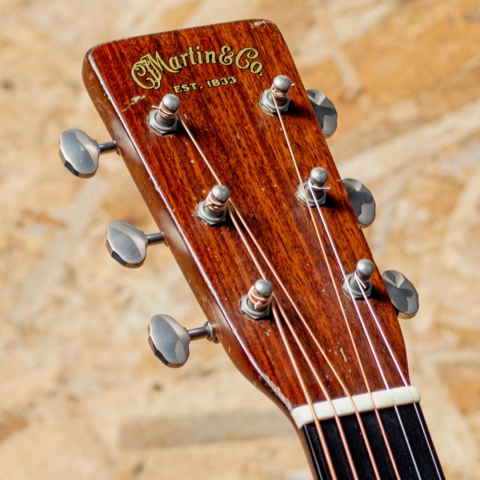 D-18。D-28と共に最初の14Fジョイントモデルが生まれて以来マホガニーサイドバックモデルの顔、ワールドスタンダードとして現在に至るまで製造され続けている名機です。本機は1942年の戦中ウォータイムに製造された品です。SEAGULLやM.Shiozakiで知られるベテランギター製作家であり、日本のMartin研究における第一人者としても知られる"塩崎 雅亮氏"によってリトップ、そして塩崎氏の元でギター製作を学び現在は独立して製作活動する”日高雅樹氏”によってネックのエボニーロッドをT-Barロッドへ仕込み直しを施した1本です。トップにはアディロンダックスプルーストップ、マホガニーサイド&バック、マホガニーネック、T-Bar ロッド、リプレイスエボニー指板、リプレイスエボニーブリッジ、ロングサドル、ペグはWaverlyへ交換。2013年に塩崎氏によってリトップ作業がされていますがオリジナルのトップ構造であるリアシフトスキャロップブレース、スモールメイプルプレート、ニカワ接着、オリジナルピックガード、オリジナルべっ甲セルバインディングを使用した組み込みで見事な復元。馴染みも出てきたのか落ち着きのある角の取れた響き。18ならではのふくよかさや暖かみを感じるスムースな響き、前オーナー様の拘りを感じるコンバートしたT-Barロッドならではの力強く凛々しさもあるしっかりとした腰の強い反応を得られます。リトップ、T-Barロッド組み込みを施し、ネックアングルの適正化、真新しい指板にフレットと、プレイコンディションも良好です。ボディサイド、バックにはいくつかのヘアラインクラック補修痕、サイドのクラックタッチアップ修正痕、サイド、バック、ネックは全体に薄がけのオーバースプレーが施されています。L.R.Baggs Lyricも搭載しており、ライブでもライン接続可能なまさに使えるヴィンテージに仕上がっています。塩崎氏ならではのオールドマーチンアプローチで個性的な味付けを行わず、ストイックなまでにマーチンへのオマージュを込めた再現。修理の域を超えた氏ならではのオリジナルを尊重した仕上がりが見事です。ソフトなタッチでの表現力からフラットピッキングでの追従性やドライブ感が素晴らしく懐の深い許容力があります。ヴィンテージの持つドライな質感とリトップの若々しい力強さを感じる事のできる逸品です。ハードケース付属。