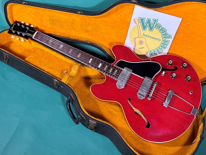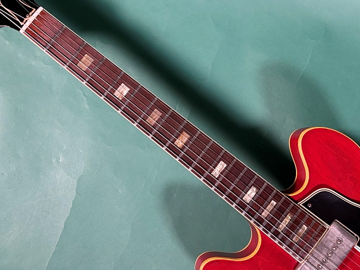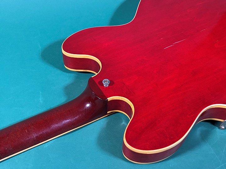 1959年に登場したES-330、外観こそES-335に似ておりますが、センターブロックを持たないフルアコースティック構造で、エアー感のあるサウンドが魅力的なモデルです。ネックのジョイントもES-335が19Fジョイントに対して、16Fジョイントとなっております。今回入荷の楽器は1965年製ですが、17度ヘッド角、レギュラーネックの1964年スペックになります。