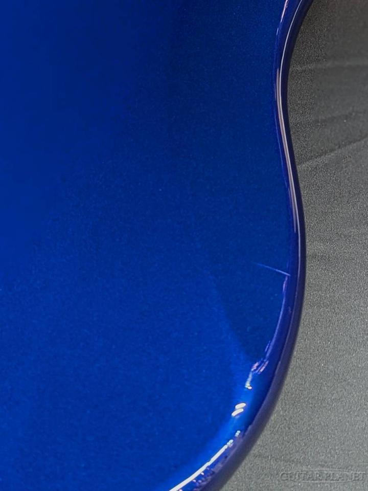 本モデル最大の特徴とも言えるのが、限定生産モデルならではのカタログ外仕様となる「ディープ・オーシャン・メタリック」です。フェンダーのヴィンテージでは存在しない鮮やかなカラーを、ボディだけでなくヘッドにも施したマッチングヘッド仕様とすることで、統一感のある印象的なルックスに仕上げられています。さらに、カラーリングに合わせたパール柄のピックガードを採用し、華やかさをプラスしています。