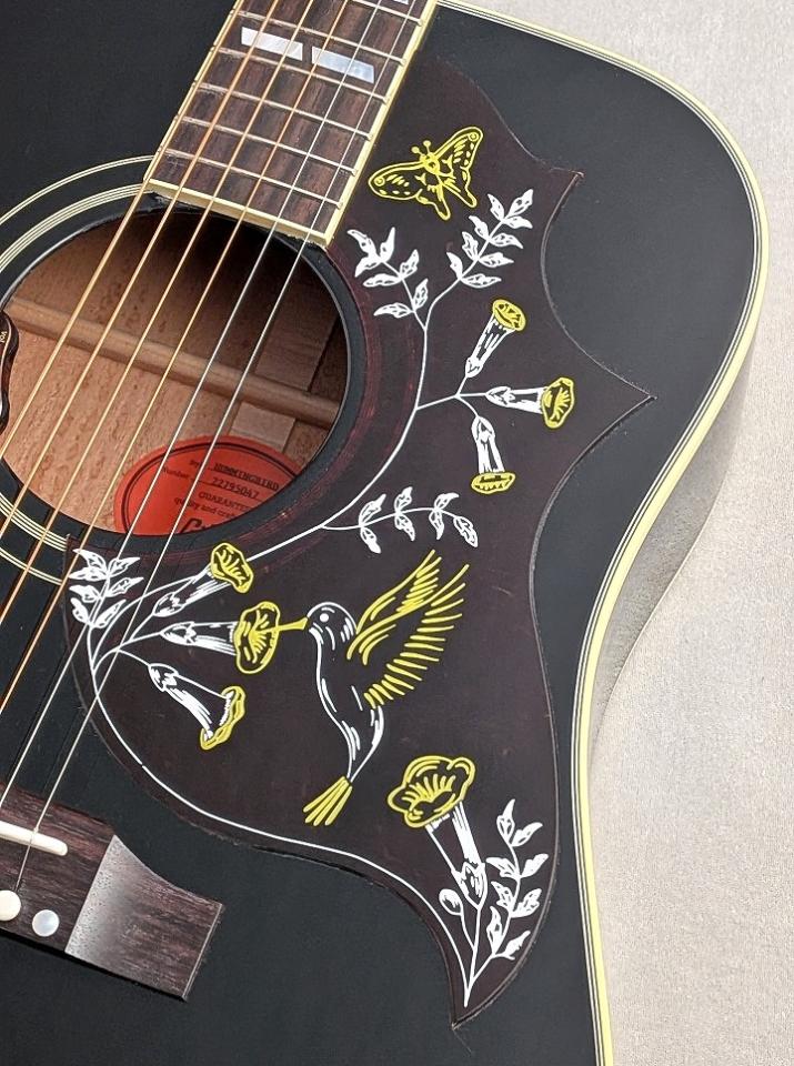 【Gibsonノベルティセットが付いてくる】カスタムショップ製の限定モデル・Greatest Hitsの1本。オールブラック×フラワーポットインレイを冠したハミングバード。