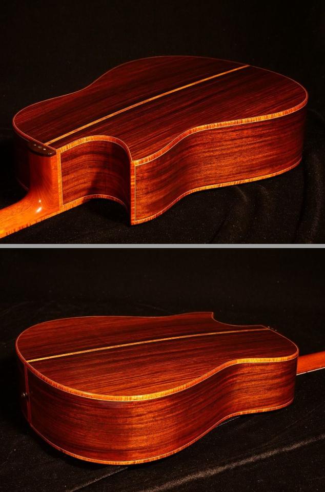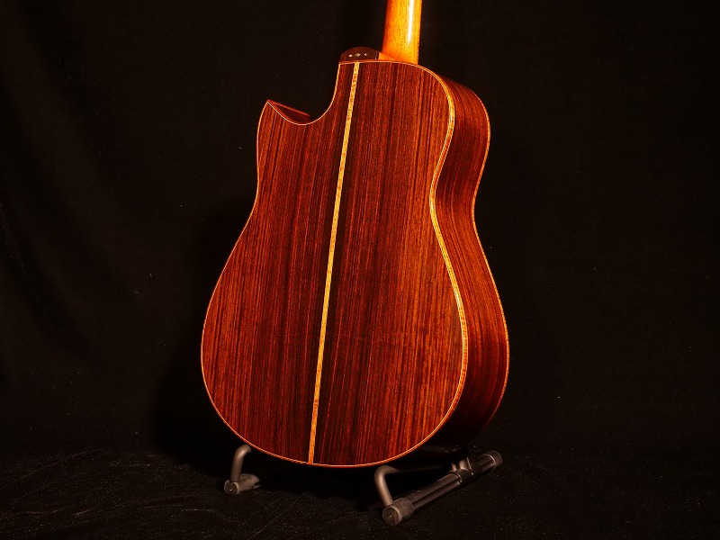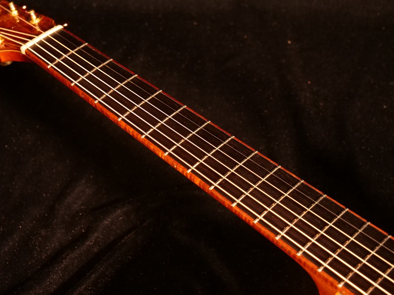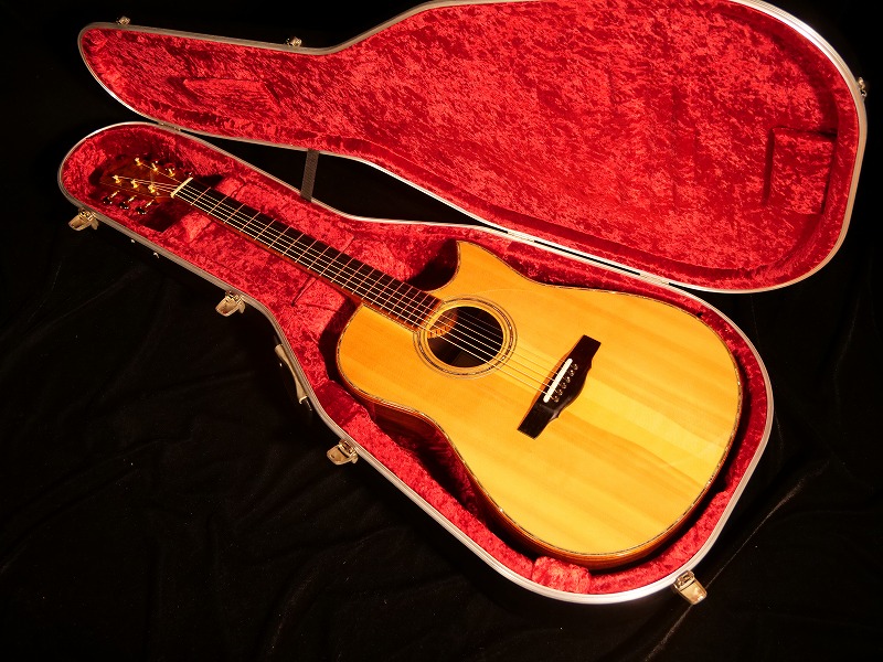 本器は2006年製。ドレッドノートスタイルにフローレンタインカッタウェイもでる。ヨーロピアンスプルースTOP、インディアンローズウッドSIDE&BACKのALL単板、マホガニーNECK、エボニー指板&ブリッジ、アジャストロッド(AJ)、ノンスキャロップドXブレイシング仕様です。
