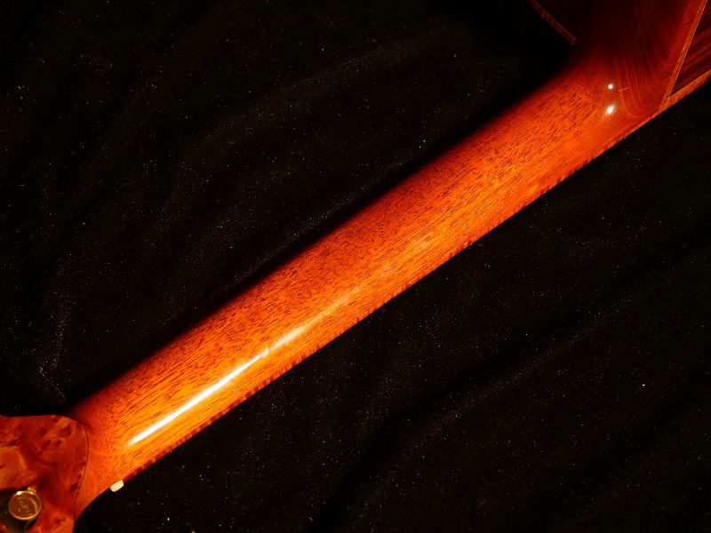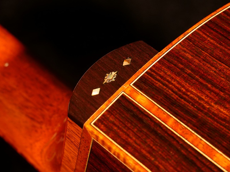 装飾はヘッド突板とバックにはバール材、GOTOH 510ペグ、ロゼッタ・指板周り・パーフリングにアバロン装飾、ネックヒール部にダイヤモンドアバロン、透明ピックガード、ハワイアンコアバインディングといった豪華な仕様です。