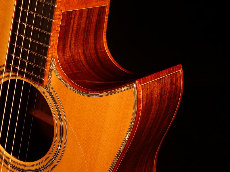 サウンドはまず、身体に響いてくるような重厚で深みのある低音。 量感があるだけでなく、輪郭が明瞭で、沈み込みながらも決してぼやけません。 コードを鳴らした瞬間、空気がゆっくりと押し出されるような豊かな響きが広がります。 中高音域は透き通るような煌びやかさ。 ガラス細工のような繊細さを持ちながらも芯は太く、 ふくよかさの中にしっかりとしたエッジ感があり、一音一音の粒立ちが非常にクリア。 分離感に優れており、和音の中でも各弦が埋もれません。 アルペジオでは立ち上がりが速く、 フィンガースタイルにも素直かつダイレクトに反応。 タッチの強弱やニュアンスを余すことなく表現してくれるため、 弾き手の感情がそのまま音になります。 力強さと繊細さを高い次元で両立した、 表現力豊かなサウンドです。