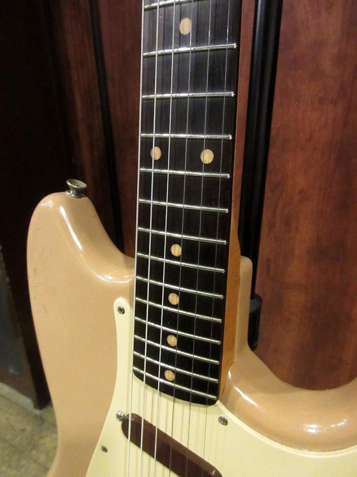 Fenderが開発した初のスチューデントモデルにして、その後Mustangに至るまでミャクミャクと続く系譜、その始祖となるモデルがMusicmaster / Duosonicです。本機は1959年製、それまでのメイプルワンピースネックからスラブ貼りのローズウッド指板へとモデルチェンジした直後の個体。スチューデントモデルとは言え、細部の造り込みや材の良さに妥協はなく、サウンド面にもそれがしっかりと反映されております。フレイミィな杢目が確認できるメイプルネックに黒々艶々なブラジリアンローズウッド指板、Desert Sandカラーながらややシェルピンクっぽい色味もナイスです♪コンディションも抜群に良く、パーツチェンジ等もないエクセレントクリーンコンディション!ピックアップ1発にショートスケールは…とお考えの方もいらっしゃるでしょうが、なんのなんの!スラブ期のストラトをそのまま小さくしたような芳醇で煌びやかなサウンドが楽しめる個体です。Pre-CBS期のFenderサウンドをこの機会に是非ゲットなさってください。オリジナルトーレックスケース付属。
