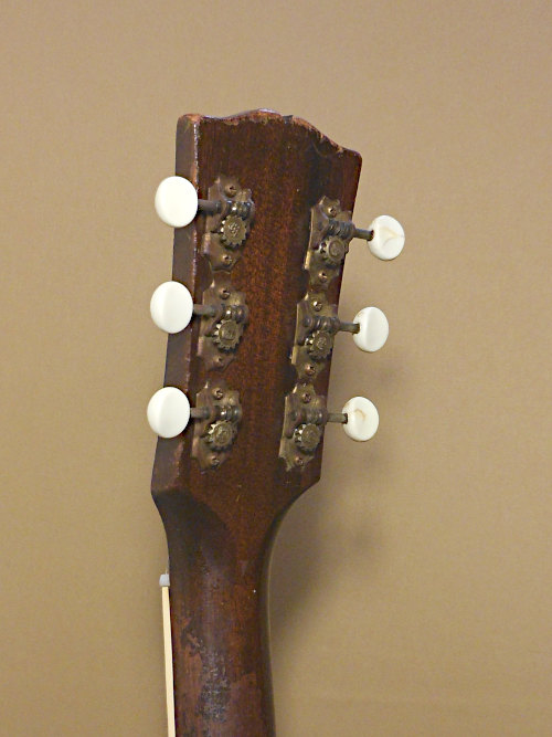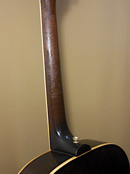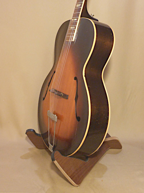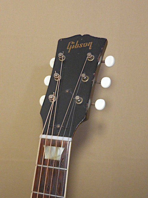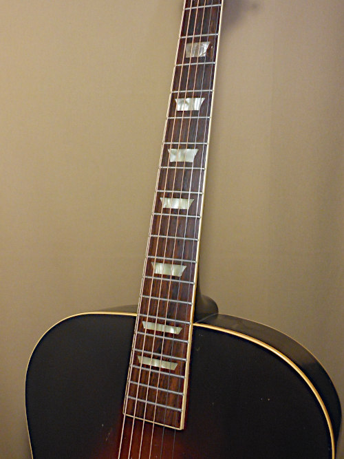 ギブソンL-50は1932年に発売。当初は15インチ弱のボディ幅の小振りなモデルでバックにもアーチがない、シンプルな構造とルックスを持った普及モデルでした。1935年に16インチボディ幅へ、ボディバックもアーチドへと変更されています。こちらのモデルはシリアルが消えてしまっている為、詳細な年式が不明ですが、ヘッドロゴのスタイルやヘッド形状がナット部からヘッド先へ向けて厚みが薄くなるテーパーヘッドであることなどからみて1950年前後の物と思われます。スプルーストップにメイプルサイド&バックでガリンと乾いたいなたい鳴りはブルースプレイヤーにはたまらないでしょう。音量もあり弾いていて飽きません。両のfホール周囲と1弦側のトップ面にクラック修理痕がありますが、調弦してテンションをかけても落ち着いた状態です。他に使い込まれた弾き傷、塗装の剥げやピックガードの欠損などありますが、ビンテージとして風格のあるルックス。フレットはやや低めではありますが音のビビリ等はなく、ネック状態も問題なく、演奏性は良好に保たれております。