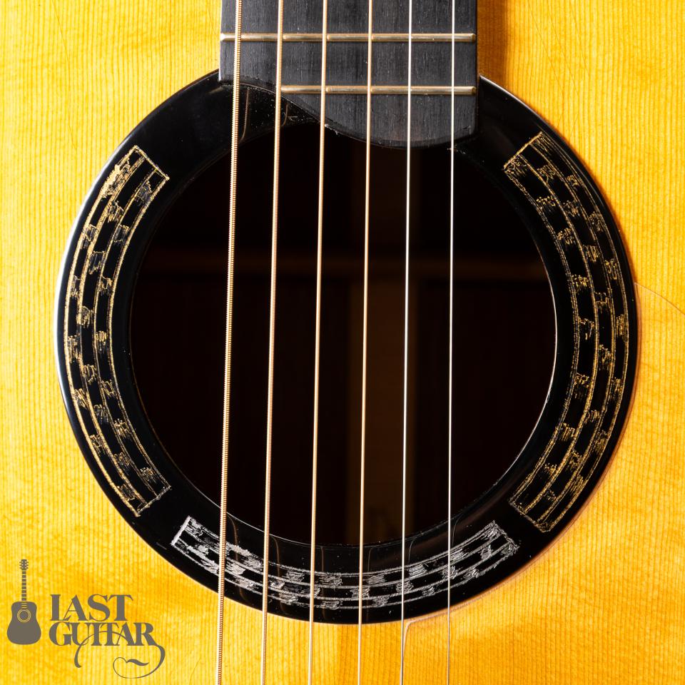 トップは、何とも味わいがある、揺れるような木目を持ったエゾ松で、和のテイストを持ったルックスにもよくマッチしています。サイドとバックのインディアンローズウッドもすごくきれいです。ネックは、密度の高いホンジュラスマホガニーで、フィンガーボードとブリッジは、黒く良質なエボニーです、ネックまわりは、43mmナット幅で、馴染みやすいラウンドシェイプです。ペグは、ゴトーのオープンタイプです。クリアガードが付いています。