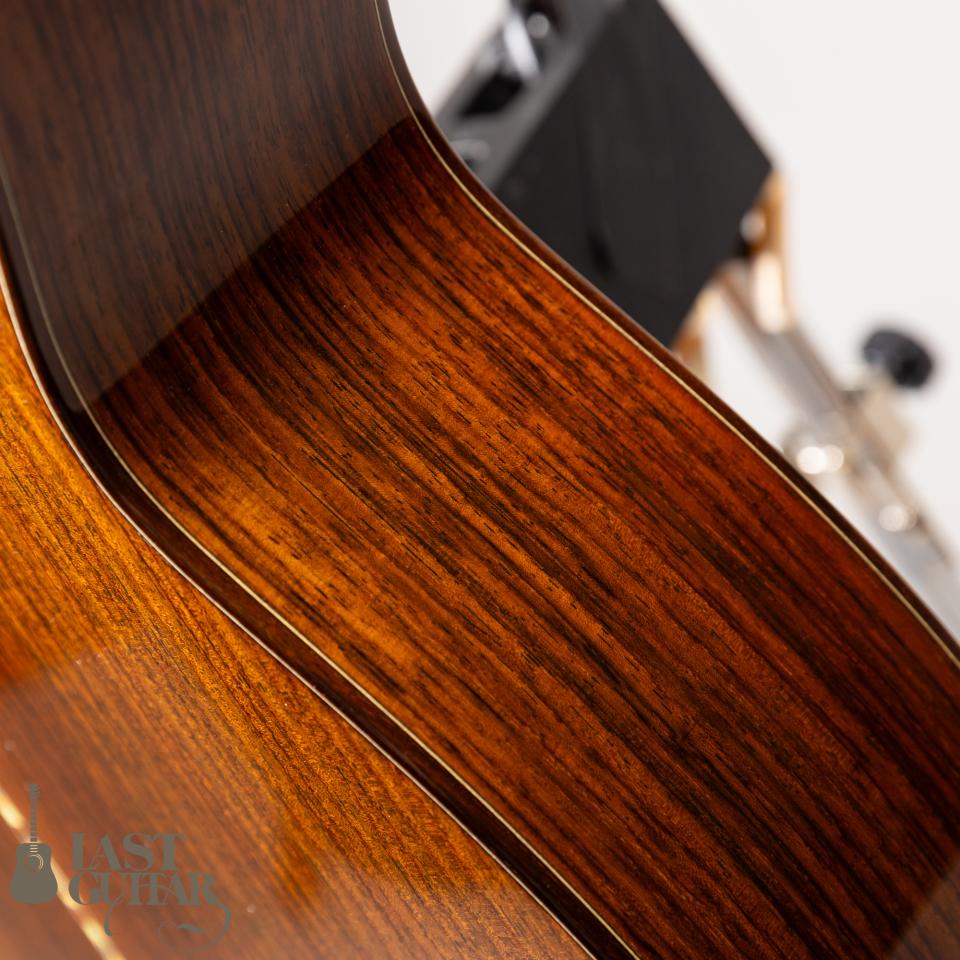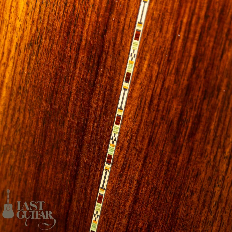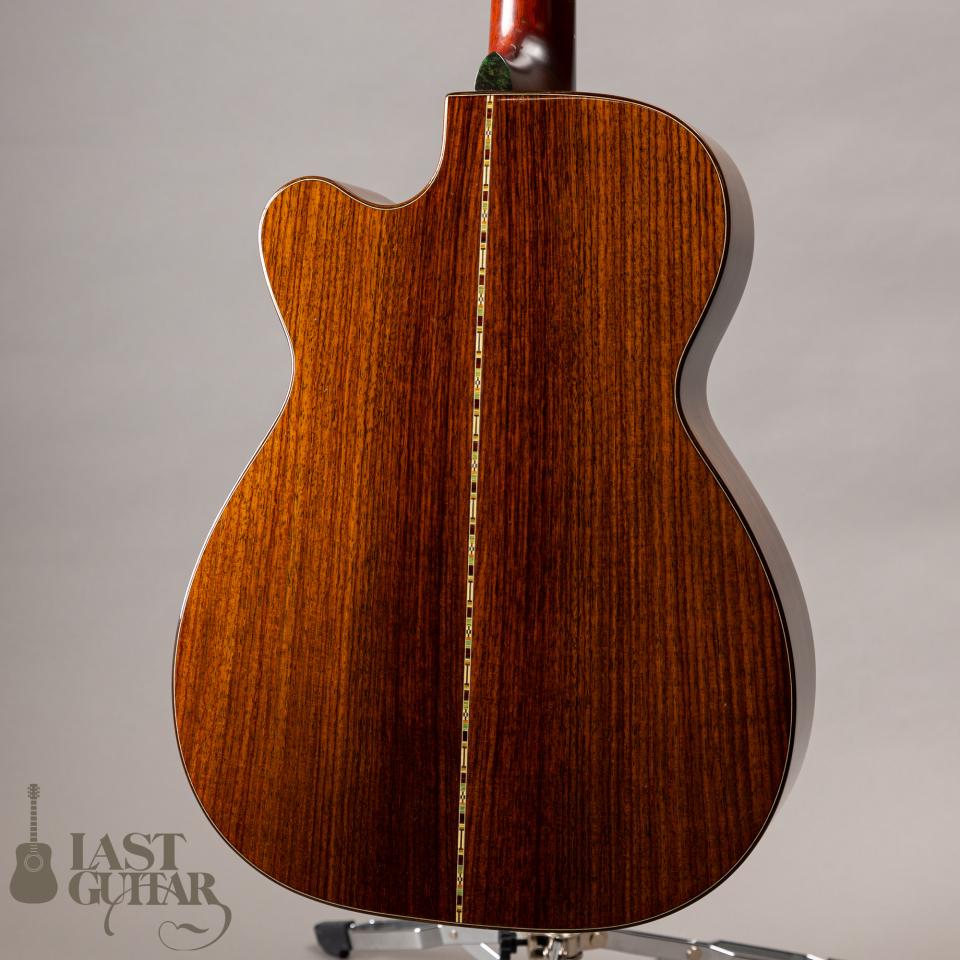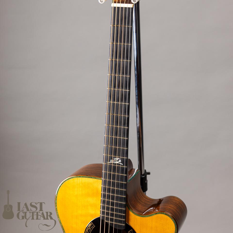 本機は、塩崎氏が全面的に手がけるブランドM.SHIOZAKIで、本漆によるロゼッタ、樺細工のヘッド・プレート、花押風“塩”マークのフィンガーボードインレイ、バックストリップなど和のテイストが印象的なルックスです。ボディサイズは、000と00の中間といったサイズで、抱えやすいです。