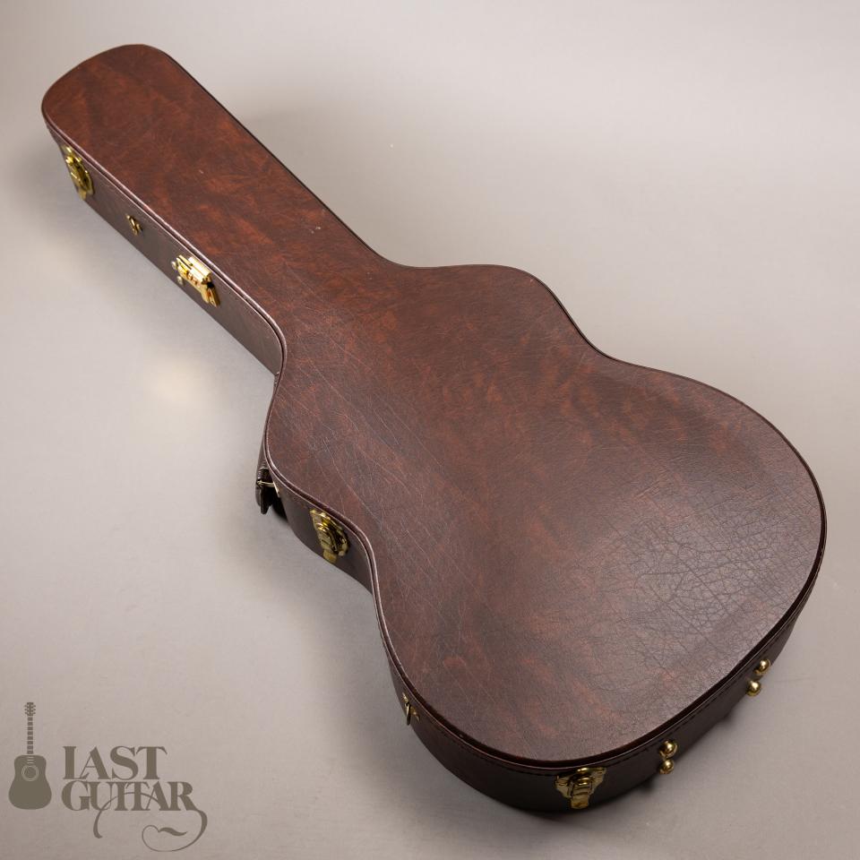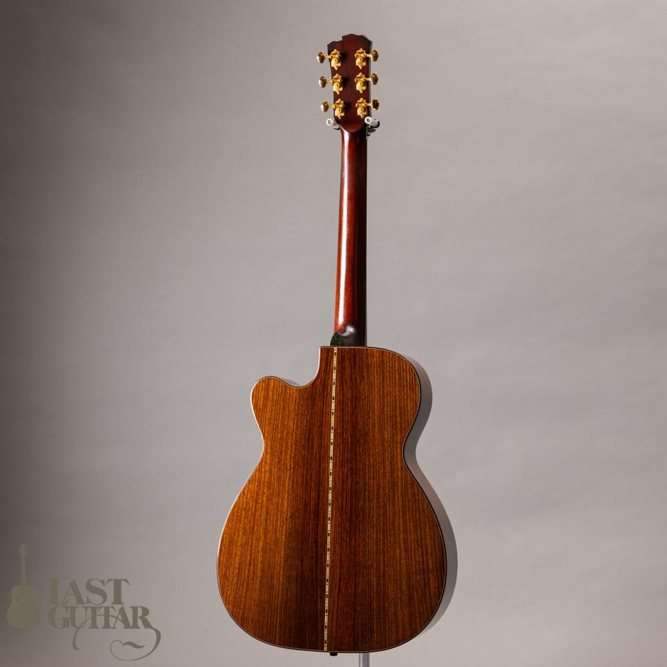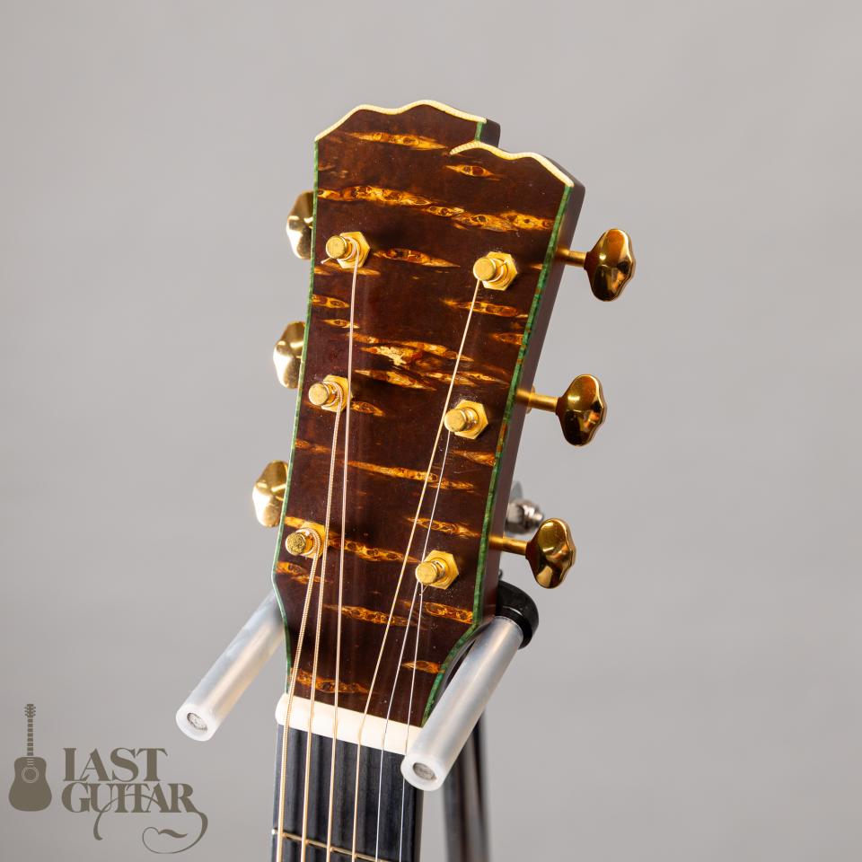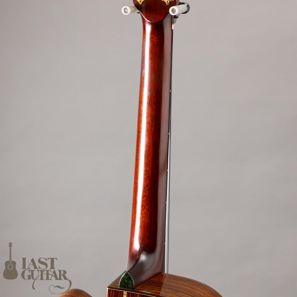 本機は、塩崎氏が全面的に手がけるブランドM.SHIOZAKIで、本漆によるロゼッタ、樺細工のヘッド・プレート、花押風“塩”マークのフィンガーボードインレイ、バックストリップなど和のテイストが印象的なルックスです。ボディサイズは、000と00の中間といったサイズで、抱えやすいです。