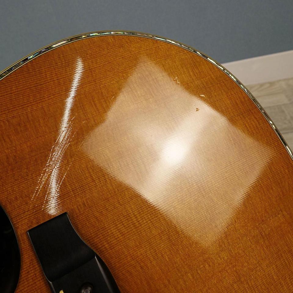 サイド&バック&ヘッドトップに割れ、疑いが数か所箇所、ヘッドトップの白濁、ピックガードの歪み(伴う割れは現状なし)。