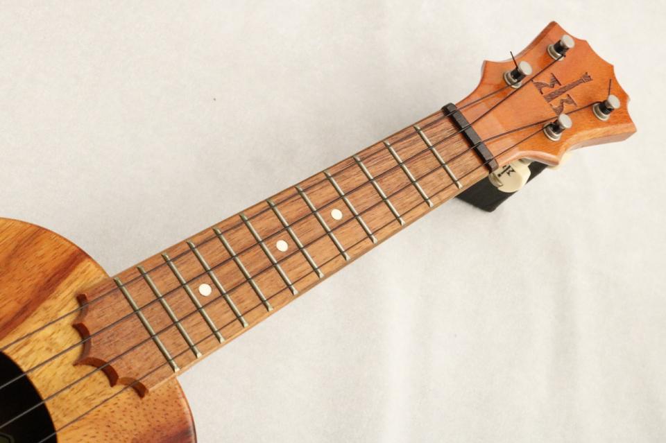 以下はKoAloha共通の仕様ですが、独特のヘッド形状は1フレット付近のコードを押さえた時にヘッドが手に干渉しないよう上部で広がっており、指板両側にはバインディングを施すことでフレットのバリが出にくい構造になっています。この個体も同様に演奏性の高い弾き易い仕様となっている為、美しい響きと演奏性の高さを感じられる一本になっています。