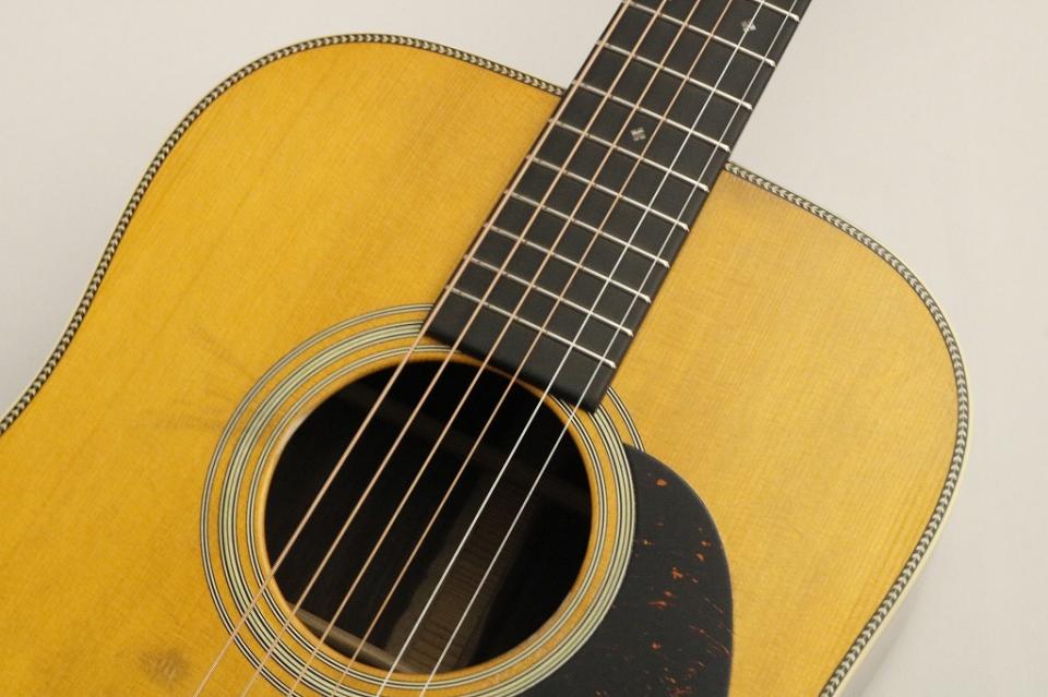 アコースティックギターといえばD-28(ドレッドノートサイズのスタイル28)といわれる程アコースティックギターを語る上では欠かせないモデルとなったMartinD-28。その製造は今から90年近く前の1931年に現在よりもさらに大きいボディサイズの12フレットジョイントボディで誕生しました。その名前は第一次世界大戦で活躍したイギリス戦艦"ドレッドノート号"のように迫力のあるサウンドを生み出すモデルとして命名されました。空間に広がる迫力のある響きからピアノに代わる伴奏楽器として人気を博していきます。その後、1934年に音の迫力を損なうことなく12フレット以上のハイポジションでの演奏性を高めるため現在と同様のボディ形状の14フレットジョイントのD-28が生産されます。そこから現在に至るまで木材の産地変更やピックガードのカラーの変更等細かな仕様変更はございますがMartinGuitarの一番人気モデルとして一度も生産を止めることなく作られ続けております。D-28は音楽の歴史と共に歩んできており多くの著名ミュージシャンにも愛用されております。海外ではエルヴィスプレスリー、ポールマッカートニー、ジョンレノン、日本では桜井和寿(Mr.Children)、草野マサムネ(SPITZ)等、私たちがレコードやCDで聴いてきたあの有名な曲のフレーズや伴奏が美しいD-28のサウンドであったために知らず知らずのうちにD-28のサウンドをアコースティックギターのサウンドとして耳に残している。楽器屋でもう一度そのサウンドを聞いた時にその時の記憶がよみがえる。そんな魔法のような魅力をD-28は持っています。 強い残響感と低音から高音までの各音の分離の良さ、花が咲くように広がる煌びやかなサウンドは一度耳にすると忘れられない美しサウンドです。今でこそアコースティックギターはシトカスプルースの表板、横板と後板はローズウッド単板今では当たり前となったこの仕様もD-28というモデルが生まれたから定着したといっても過言ではないでしょう。長い歴史の中で世界中の音楽好きに愛されたD-28を是非この機会に手に取って見て下さい。