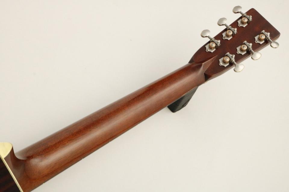 Authenticシリーズは『完全復刻』をテーマに各年代のモデルを細部まで忠実に再現し、現代にそのサウンドを復活させるべく取り組まれたMartinGutirarラインナップの中でも最高グレードのシリーズです。D-28Authentic1937はその名の通り1937年製のD-28をベースに復刻されており、アディロンダックスプルーストップ、サイド・バックにはブラジリアン・ローズウッドに最も近い音質特性を持つと言われる木材のひとつ、グアテマラローズウッドを使用。ネックには正真正銘のマホガニー、指板、ブリッジは上質なエボニーを使用。見えずらい箇所での特徴としては、シンプルなネック補強材のT-Barロッド仕様、最低限の薄いラッカー仕上げのVintageGlossFinish、精度の高い木工と接着剤に『ニカワ』を使用していることも挙げられます。ネックの素材の大半がワンピースマホガニーであることでT-Barロッドネックの音の伝達性の高さはSQネック、AJネックとは一線を画した感覚があります。また、接地面の木工精度を高める事と常温で非常に硬く固着してくれるニカワの特性が相まって、接着面での振動の減衰が少なく、弦を鳴らした瞬間にボディからヘッド迄ギター全体で響きを生み出してくれます。現行品同様の約44.5mmのナット幅と肉厚なソフトVシェイプネックは1937年製ならではの握り心地。現行品や1941年スタイルのD-28と比較すると太いネックですが、このネックだからこそ響く太いサウンドがネックを握る左手からもビリビリと感じられます。クリアで洗練された響きでありながら、粘りのある低音、ふくよかな中音、クリスピーで抜けの良い高音がそれぞれ分離良く共存しており、Martinの歴史の礎に触れることが出来る素晴らしいサウンドと言えます。AgedモデルはD-28 Authentic 1937を製作した後にあえて弾き傷やウェザーチェックを入れ、指板やブリッジ等手が多く触れる個所へ手作業でAged加工を施したさらに手の込んだモデル。Aged加工によりさらに響きがさらにクリアにさらに音量が多く鳴る印象。個人ではなかなか到達することの難しい味のある外観と併せて非常に魅力的なモデルになっています。