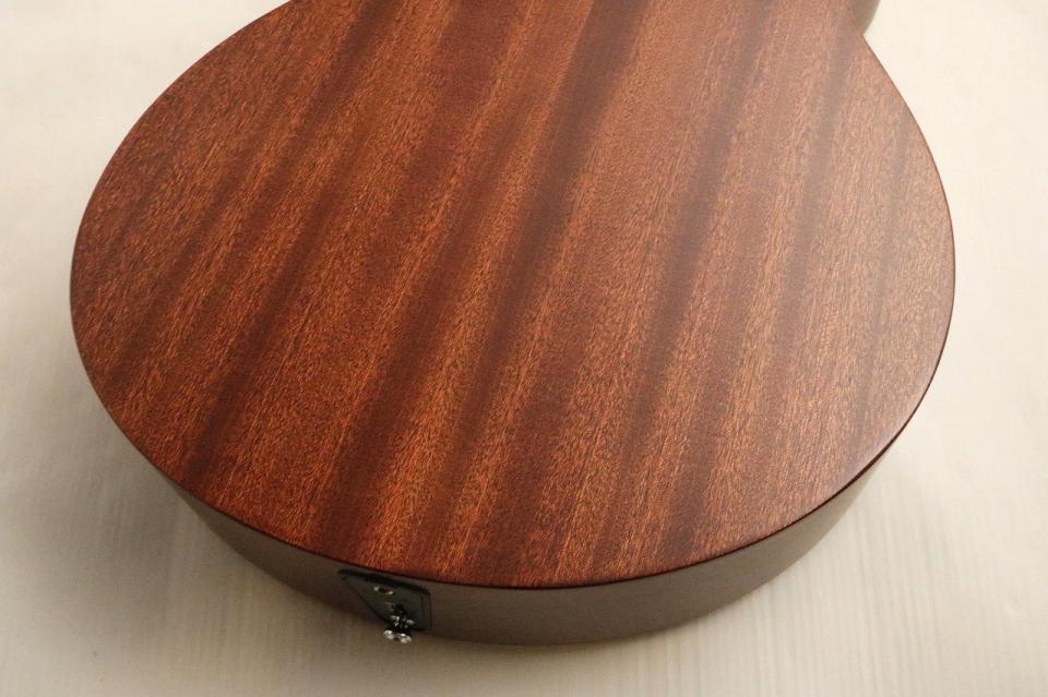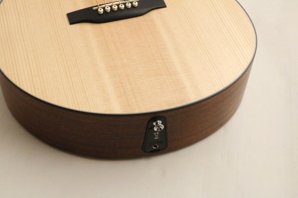 ライブでの使用を考えピックアップはMartin E-1搭載。ペダルやクリップチューナーを使用することなくサウンドホール下部に目を落とすと使用できるチューナーが設置されています。コントロール部にはボリュームダイアル、トーンダイアル、チューナースイッチ、フェイズスイッチがコンパクトにまとめられており、操作性も抜群。さらにボディエンド、ストラップピンと一体型の電池ボックスが増設されている為、電池交換も容易に行えます。