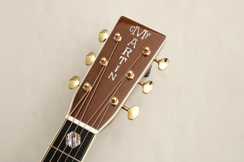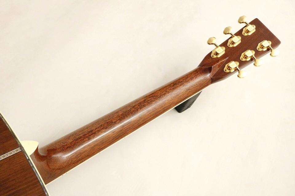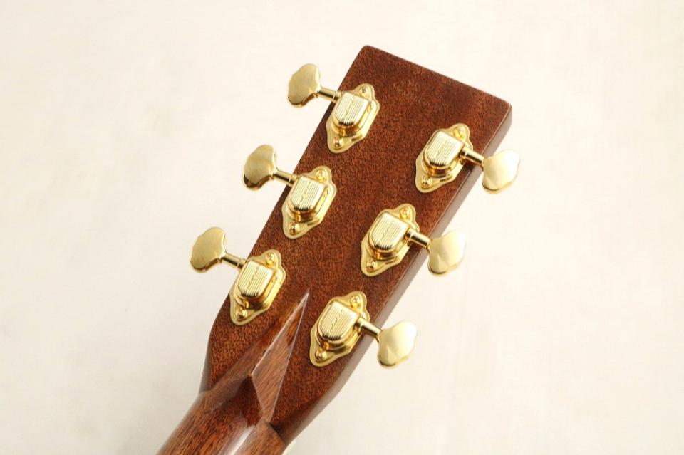1940年製のD-45を現代の視点から復刻した当社オリジナルオーダーモデル。ヘッドロゴにはGoldenEraスタイル、白く輝くマザーオブパールと細めの字体。併せてヘッド裏のバックスタンプも入っています。ペグはGroverのゴールド、クローズドギア(153GM BB Btn)現行のクローズドギアペグとは違うクラシックカーのようなデザインのペグ。ヘッドだけでも他のモデルと一線を画した拘りと魅力を持ったモデルになっています。