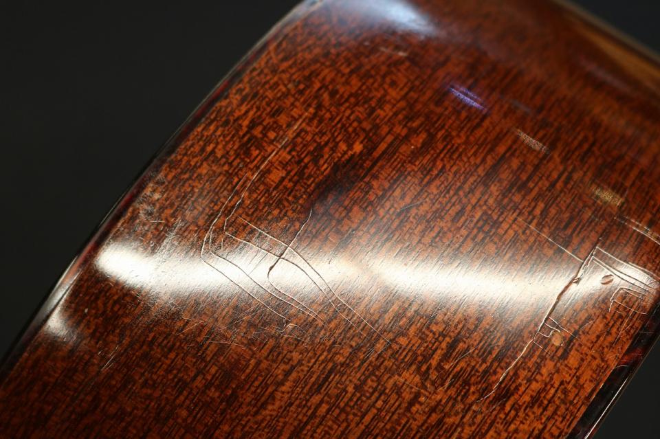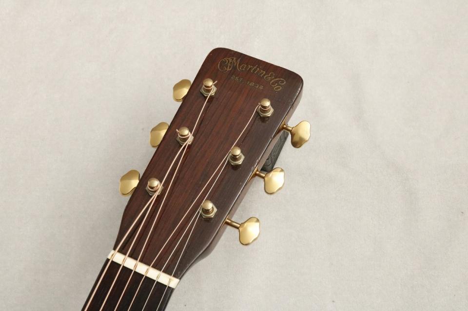 トップのスプルース材とサイド&バックのマホガニー材の木目も非常に整っておりきれいな仕上がりです。指板とブリッジのブラジリアンローズウッドが色濃く美しい木目をしており、現行品では中々見ることができない鮮やかな色合いをしております。