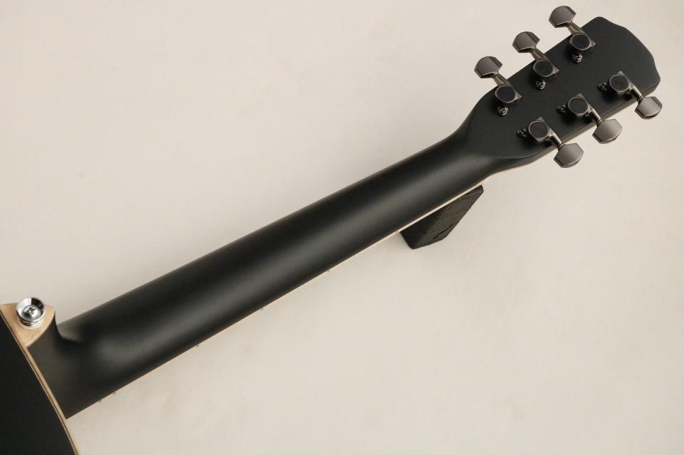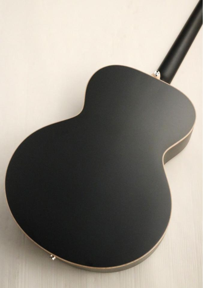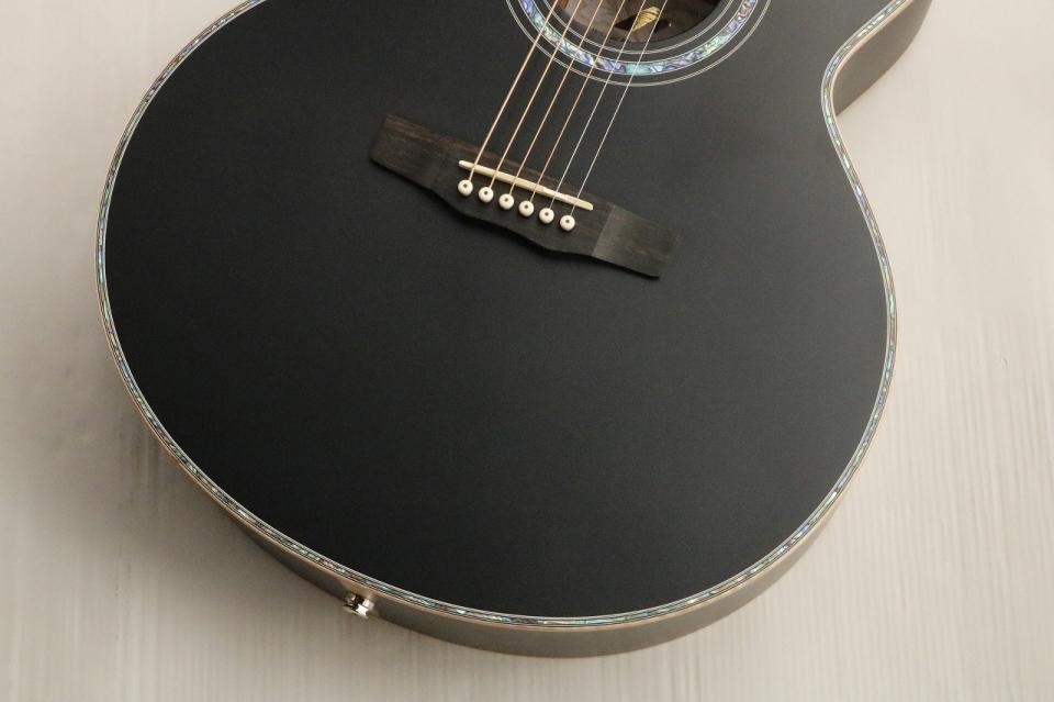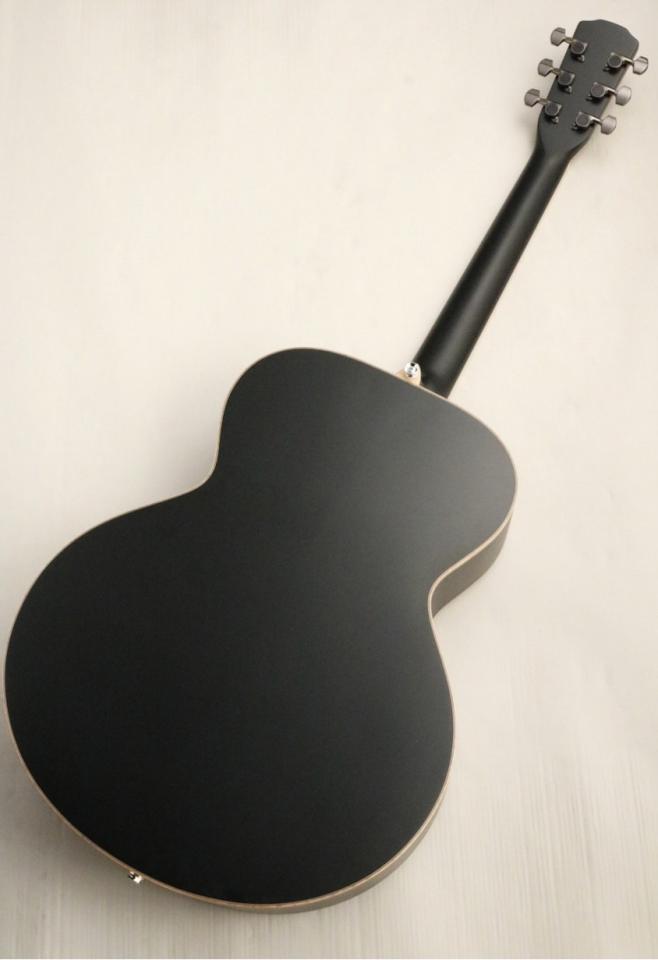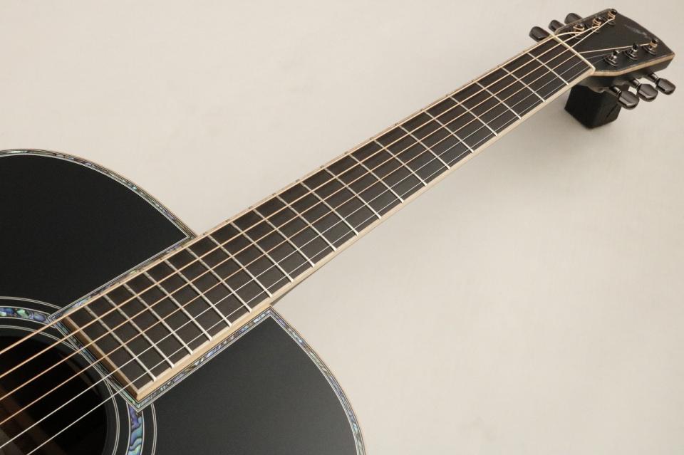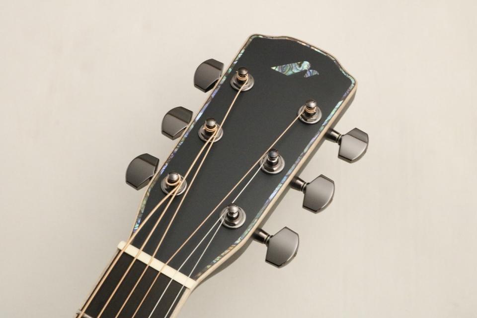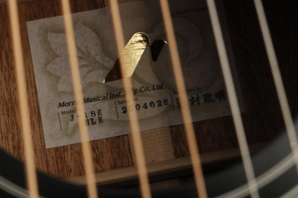 当社スタッフがモーリス工場にお邪魔して木材選定からカラーオーダー、その他詳細な仕様を入念な打ち合わせとともにオーダーをした念願のモデル。このモデルを作るためにはるばる長野まで行ったといっても過言ではありません。今回目指したのは、昔からモーリスを愛するファンの人にも納得してもらえた上で" 新しいモーリスファンに向けたカッコイイモーリスを届けたい!!" …この気持ちを形にさせて頂きました。そこで注目したベースモデルがセミジャンボサイズの " J-18 " です。小ぶりでありながら厚みのあるボディとたっぷりとしたシェイプにより非常に安定感のあるサウンド且つ抱えやすい絶妙なボディシェイプ。特にサウンドは非常に魅力的で、セミジャンボのボディとMorrisの特徴の長めの弦長と混ざることでバランス良く煌びやかなサウンドで鳴ってくれます。コードストロークからアルペジオまで非常に鳴らしやすいと思いますので誰が弾いても好印象なサウンドで鳴ってくれるギターです。セミジャンボ、ロングスケールの組み合わせだけでも非常に珍しい使用ですがさらにこのモデルは外観にもこだわり、サテンブラック、アバロンインレイ、メイプルバインディングかっこいい組み合わせも採用しております。絶対な人気を誇るブラックカラーにサテンフィニッシュを採用することで薄めの塗装で鳴りを損なうことなく塗りつぶしができるため、外観からは意外な程の鳴りやすさを感じます。黒に映えるアバロンインレイとそれをまとめ上げる美しいフレームメイプルのバインディングは手に取って眺めるだけでも惚れ惚れする美しさ。さらにシンプルかつ高品質なピエゾタイプのアコースティックピックアップB Band A1.2Mが初期搭載されておりエレアコとしてもすぐれたサウンドが楽しめます。ぜひこの機会にお手に取ってみてください!