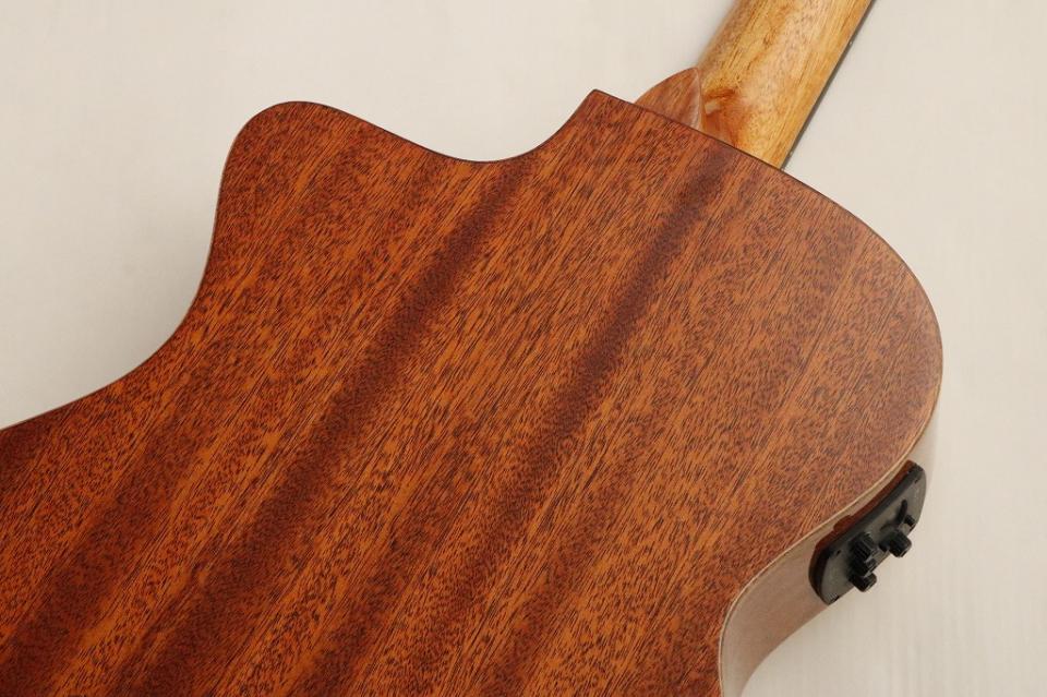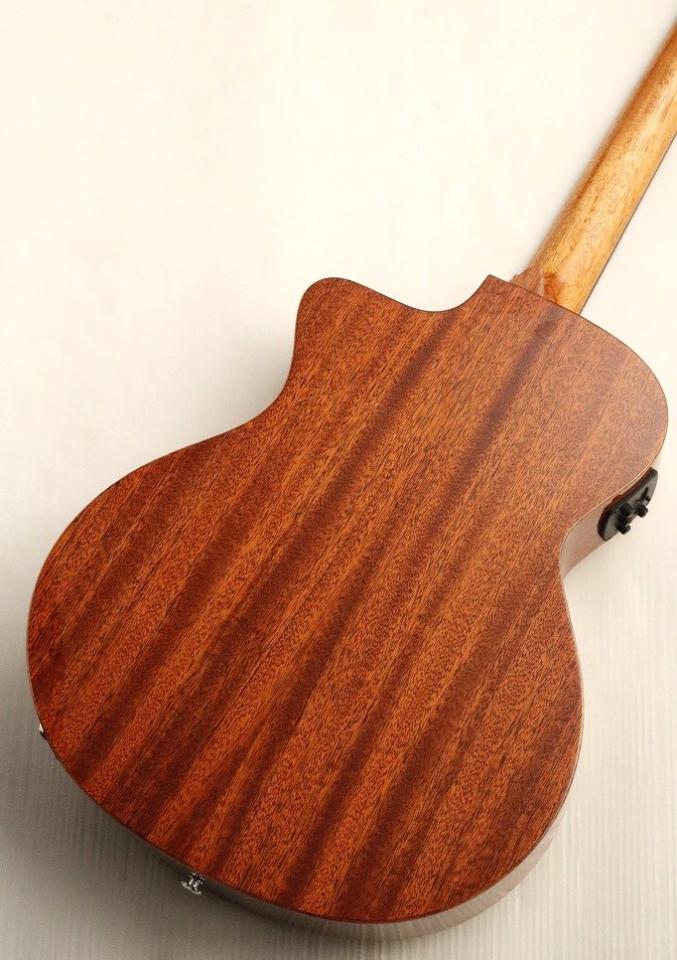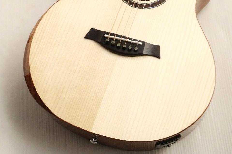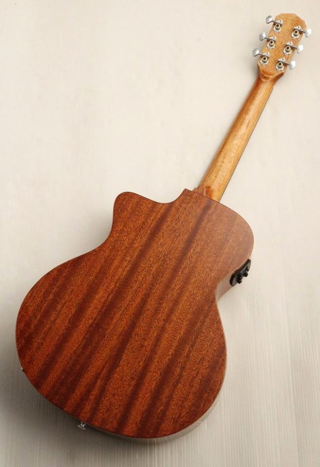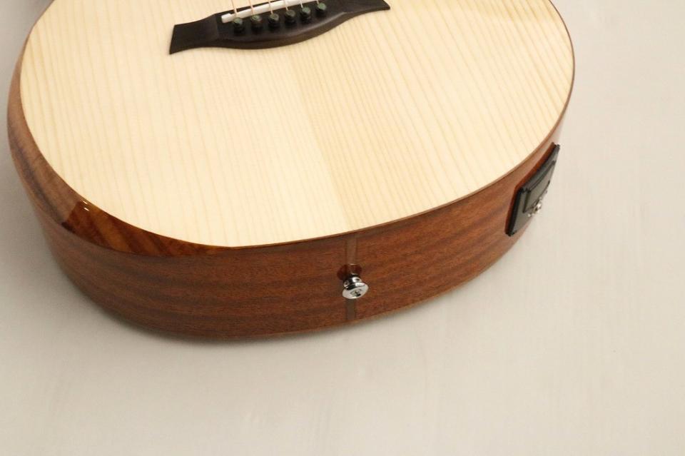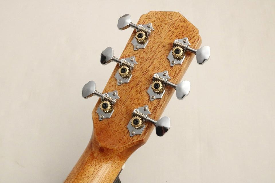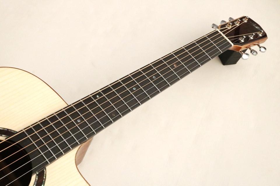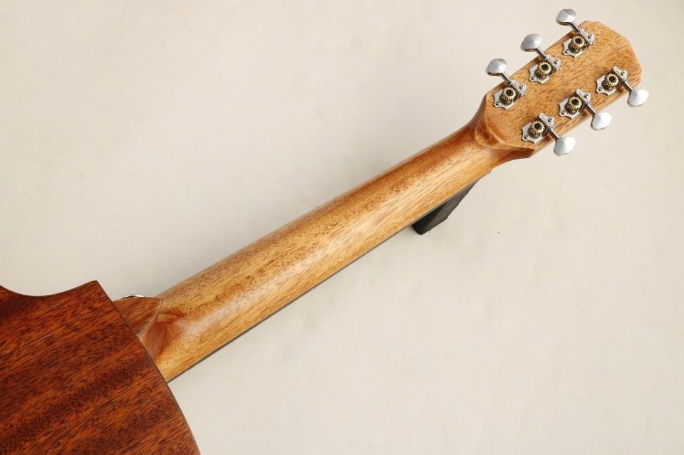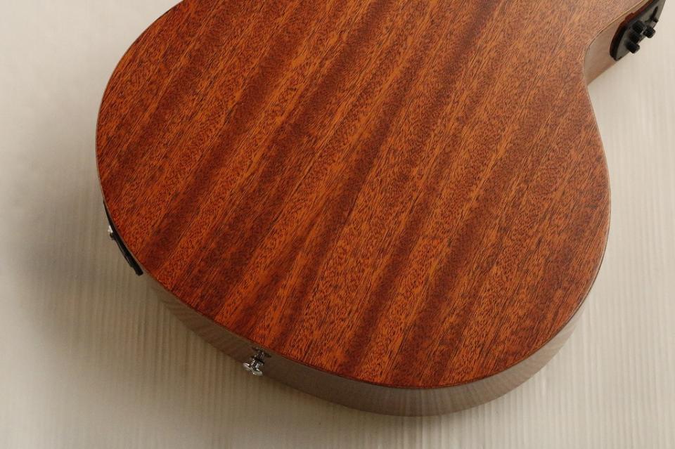 トップはスプルース単板、サイド&バックはマホガニー。スケールは596mmと短くなり、小ぶりなボディサイズになることでよりお子様や女性にもおすすめの軽く抱えやすいモデル。フルサイズと比較して音量は若干小さくなりますが、立ち上がりの良いサウンドと演奏性の高いボディシェイプで弾き語りはもちろんフィンガースタイルのソロギターでも活躍できるモデル。なによりもこの価格帯でクオリティの高い作りが実感できます。