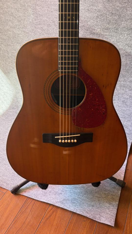 1970年代のFG-500です!オリジナルのピックガードはセルロイドのために朽ち果ててボロボロだったのを、張り直ししておりますが、ネックコンディションも良好で元起きもなし!