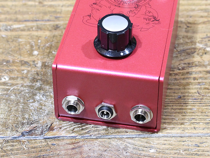 本機はファズブースター。真ん中の大きなノブが3wayのロータリースイッチとなっておりGAIN量を変化させます。ON/OFFのLEDライトの部分が透明なミニつまみとなっており、こちらがマスターボリュームとなります。