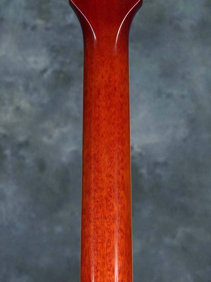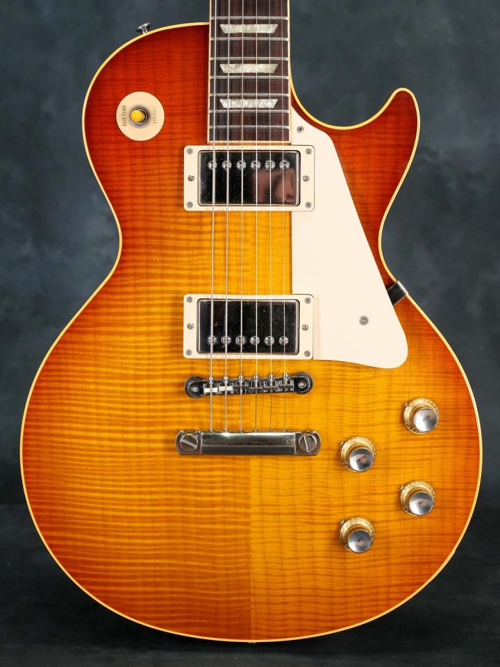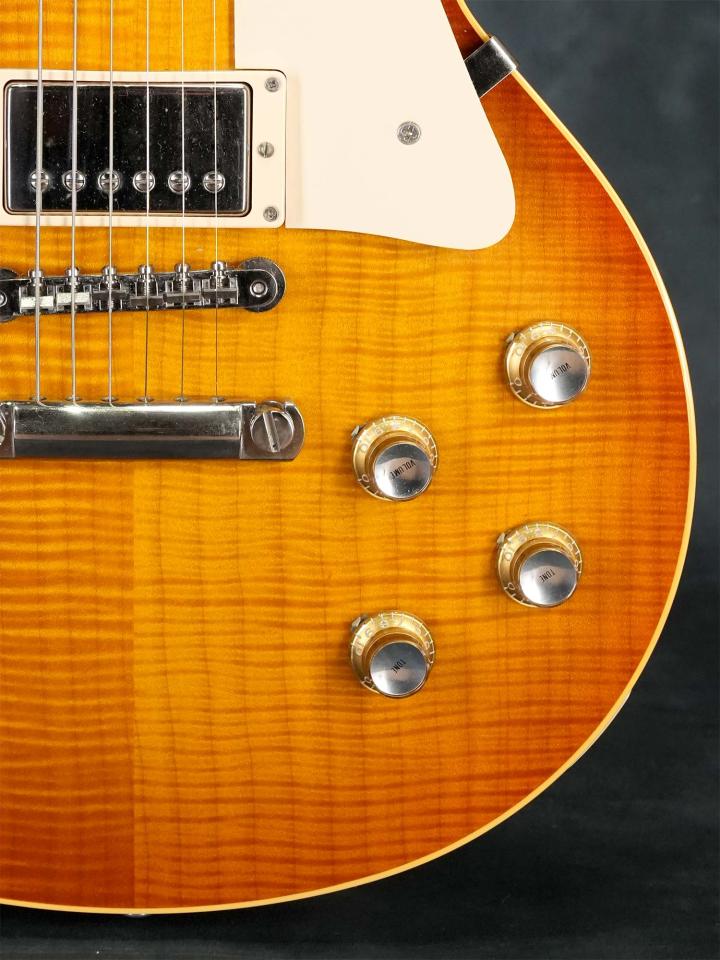 濃淡が強く細身で揺らいだ美しいフィギュアドメイプルTop&マホガニーBackのボディ、1960モデルならではの薄身なマホガニーネック、色濃く目の詰まったローズウッド指板、ピックアップはフロント&リア共に57 Classicを搭載し、コントロールノブは1960年より採用されたリフレクターノブを採用。