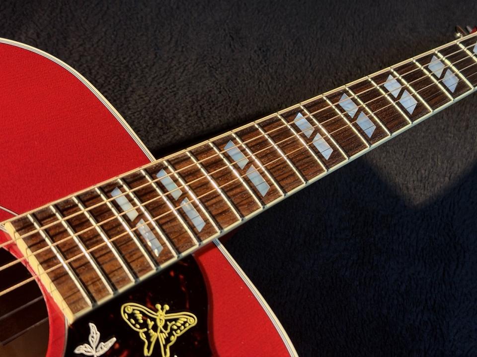 ヘッドのクラウンインレイ、指板のダブルパラレログラム(平行四辺形)インレイ、ネックバインディング等高級モデルの装いと鮮やかなチェリーサンバースト仕上げで人気を博します。
