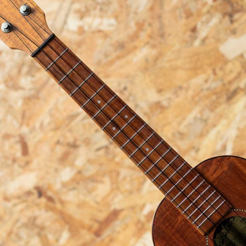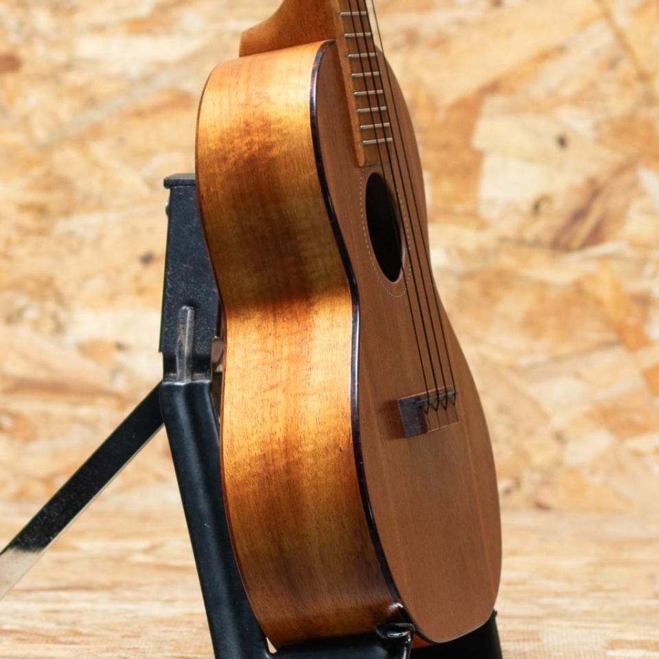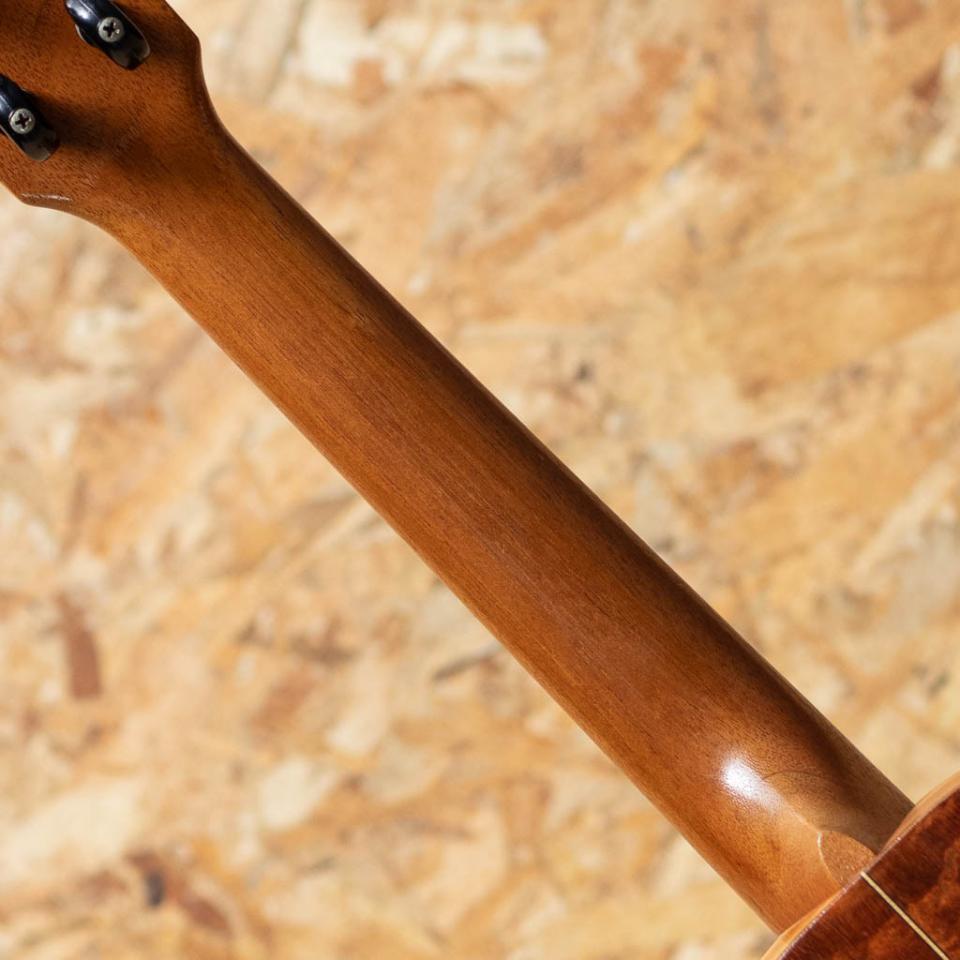 「コオラウ」はハワイのオワフ島にて製造するウクレレメーカー。約40年前より元は家具製造業を行っていたJohn Kitakis氏により創業され、その後ファミリーにて製造の役割を分担。現在も創業者のJohn氏を中心に精度の高いウクレレを作り続けています。本器はハワイアンコアボディにシンプルな装飾、オープンポアフィニッシュにて仕上げられたコンサートウクレレ。ネック、指板&ブリッジも全てハワイアンコアが使用されたオールコア仕様です。トータスシェルセルロイドによるトップバインディング、ロープ柄ロゼッタが施されており、ブラックボタンのフリクションペグが搭載されています。オールコア仕様だからこそのオールコア仕様ならではの甘くもカランとした心地の良い響きは格別です。バックに7.5センチほどのクラックがありますが、しっかりと補修がされています。その他小キズなどの使用感はあるもののネックコンディションは良好で扱いやすいセッティングです。ボディ全面にうっすらとフィギャード杢が見られ、眺めるだけでも楽しめる逸品。メイドインハワイのウクレレにグレードアップをお考えの方は是非ご検討ください。汎用ソフトケースが付属します。