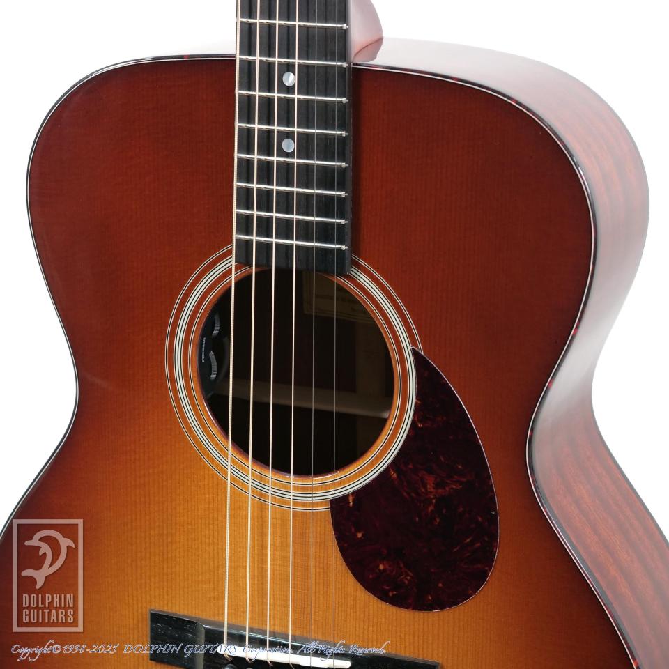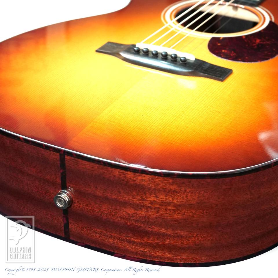 本器は、ベッコウ柄バインディングとゴールドバーストの組み合わせが美しい、E1シリーズE1-OM-DLX-GB