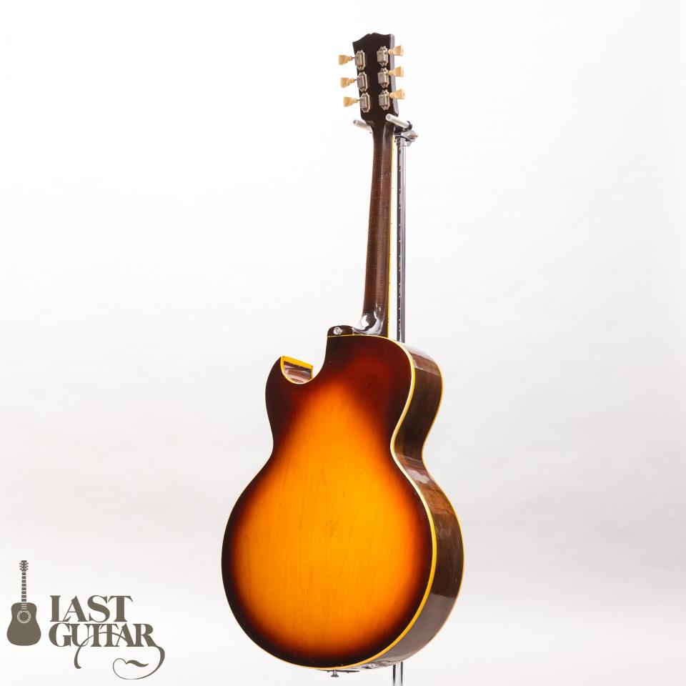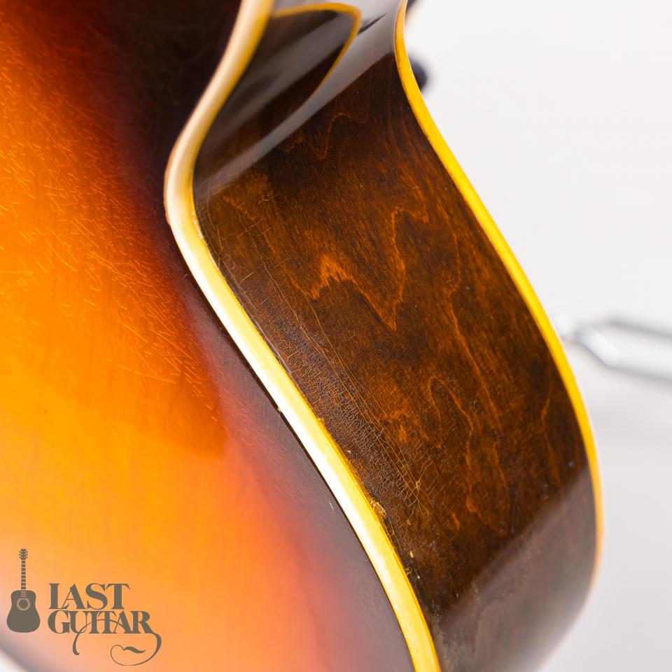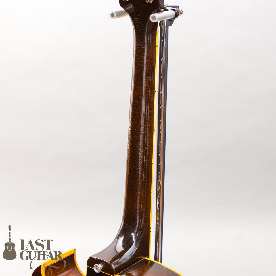 主なスペックは、16インチ幅のフルデプスボディに、フローレンタイン・カッタウェイ、ラミネートメイプルボディ、ローズウッドフィンガーボード、ミディアムスケール、ジグザグ・テイルピース、GIBSON/DELUXE刻印入りペグといった内容です。重量は、約3.10kgです。ピックアップは、ステッカー・ナンバードを2基搭載しており、とても味わい深いトーンをアウトプットしてくれます。製造年につきましては、オレンジラベルのシリアルナンバー等より判断しております。