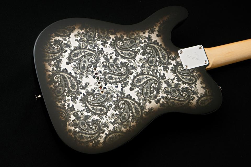 今回はボディトップの外周をブラックバースト仕様にすることで、高級感と重厚感のあるルックスとなりました。ペイズリー柄が見えるよう、テレキャスターモデルはピックガードが透明となります。