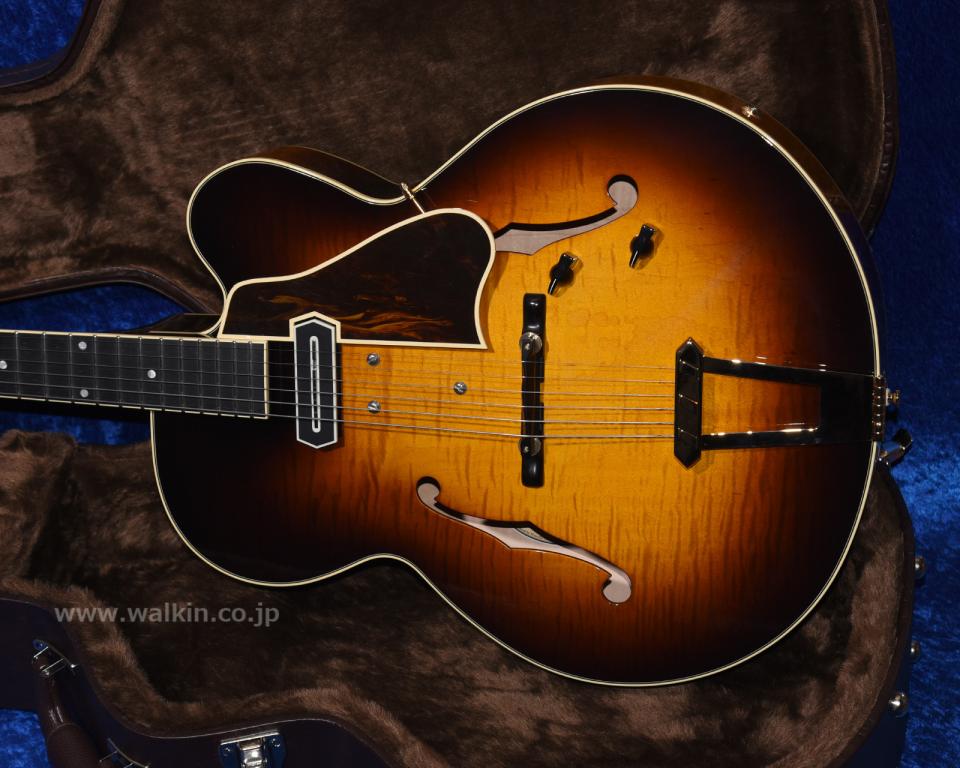 特注のAAAグレード・ハードメイプル・プライウッド、薄く丁寧に仕上げたグロスのラッカー塗装、そしてオリジナルのCCピックアップ、合わせて製作された専用設計のピックガードなど、ディテールも拘りの仕様。エボニー製のブリッジ・アッセンブリーについては、実際にバーニー・ケッセル氏が使用していたES-350を現在所有する米国人ギタリスト、ブルース・フォアマン氏より多くの資料をご提供頂き、そのデザインをベースにより実用性を高めた仕様にて、弊社工房にてハンドメイドいたしております。