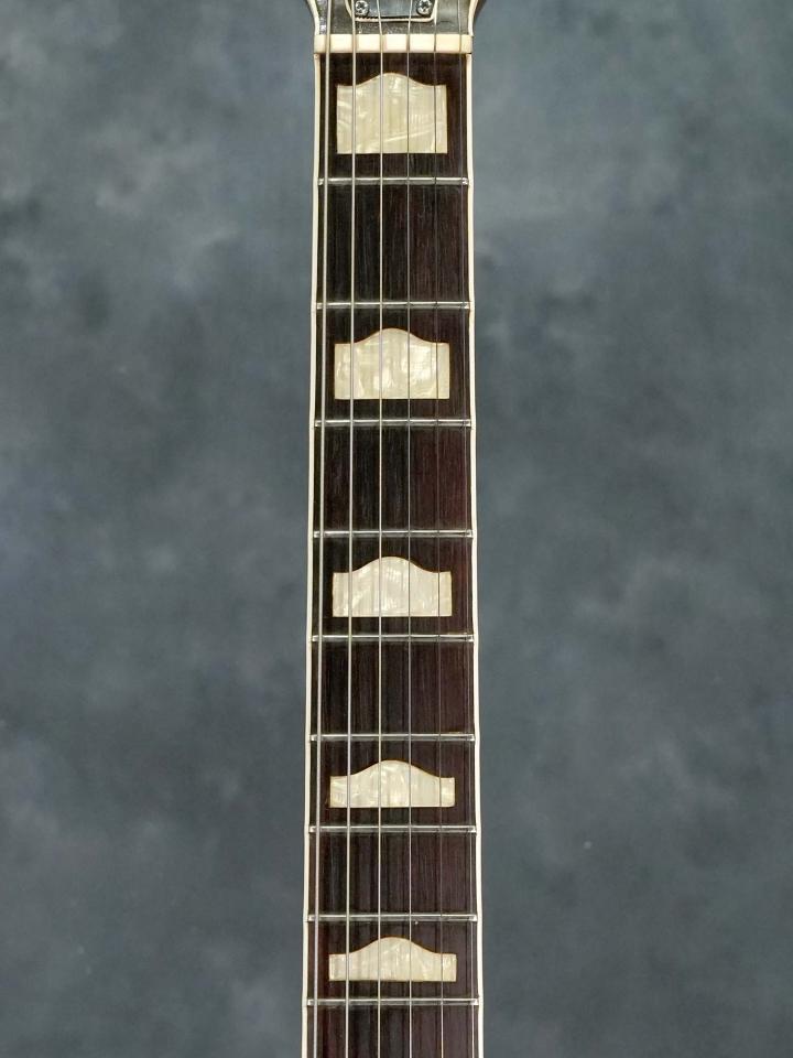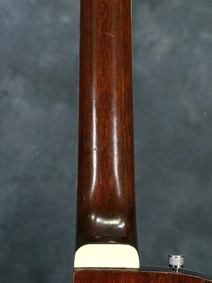 ネックはほぼストレートの丁度良い状態でトラスロッドの効きも良好、オリジナルのナット&フレットは消耗しておりかなり低くなっているため、弦高を低めに設定した場合はビビりの出る箇所はありますが、極端な音詰まりなどは無くオリジナルのエッジド・バインディングを尊重して交換は行っておりません。