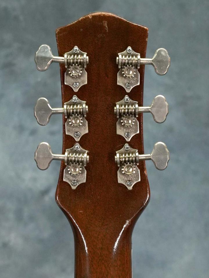 大きくくり抜いたチェンバー構造のマホガニーバックに緩やかなアーチを描いたトップのボディ、マホガニーネック、色濃く木目の詰まったハカランダ指板、六角形のブッシュとオープンバック/バタービーンノブのGROVERペグ、各弦毎にオクターブチューニングが可能なメリタブリッジ、ピックアップはフロント&リア共にシングルコイルのDeArmondダイナソニックを搭載し、3-Wayトグルスイッチ+カッタウェイ付近のMaster Volume+2-Volume&Master Toneのコントロール。