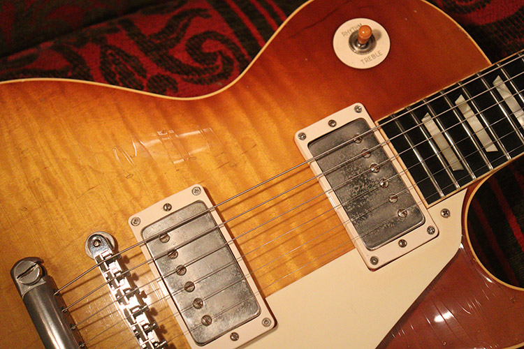 今回入庫は、ホンジュラス・マホガニーにハード・メイプル・トップを併せた59年・バースト・レス・ポールを再現した機体で、フィニッシュはニトロ・セルロース・ラッカーを使用し、傷等の使用感や上記のウエザーチェック等も再現されています