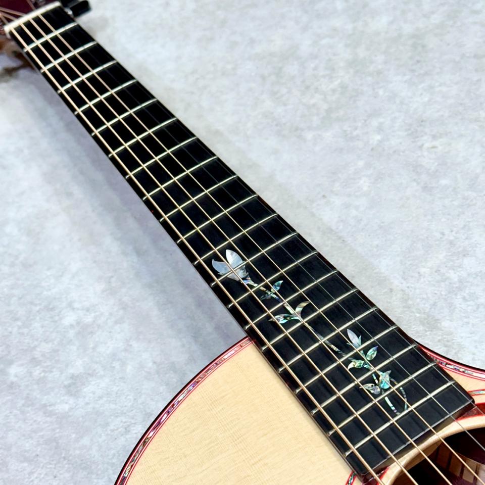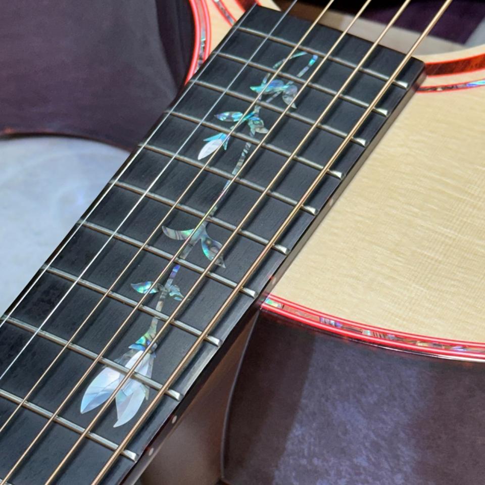 指板にはリンドウ(リンドウ科リンドウ属の多年生植物)をモチーフにしたエレガントなインレイを配置。