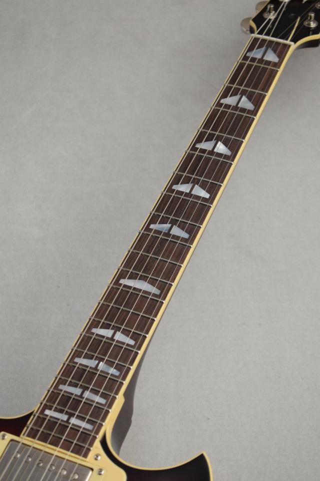また、ギターを高い位置で演奏するプレイヤーのフィット感を高めるためにSG1000/2000/3000に施されていたボディバックのコンターカットはなくなりました。ギターを低い位置で持つプレイヤーが多い現状においてはあまり必要でなくなったことと、それよりもフラットバックにしてマホガニーの質量を増やすことでローミッドのレスポンスが向上するというメリットを優先しました。