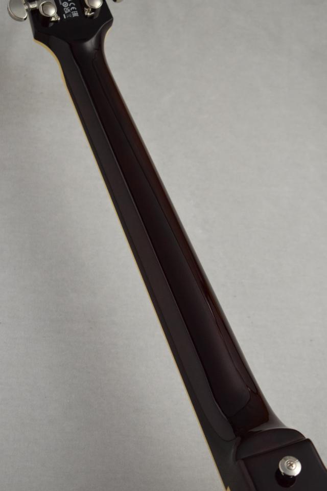 ボディトップのアーチ形状は従来よりも急カーブを描くように改良されています。ブリッジ&テイルピースを配置するボディトップは厚みのあるメイプル材で弦振動をキャッチし、そこからボディ外周に向けてメイプル材を徐々に薄くしていくデザインにすることで、弦振動のボディ全体への効率的な伝達と最適な重量バランスを得ています。